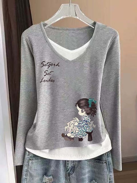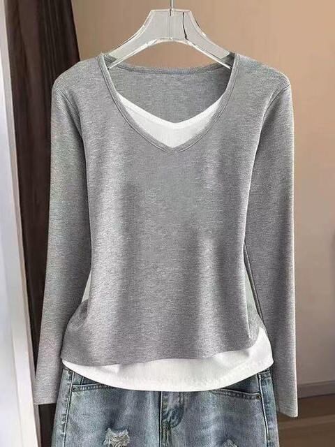 **スタイリッシュなヨーロピアンスタイルの純綿フェイクツーピースVネックスリムフィット長袖Tシャツ(女性用)**