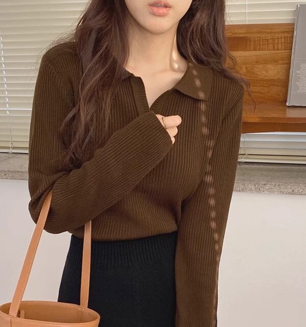 おしゃれ好きな皆様にぴったりな、トレンドを押さえたブラウンのニットセーターが新登場しました!ポロカラーが特徴的で、初秋のコーディネートにも最適なアイテムです。