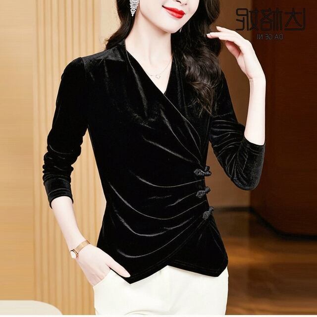 **2024年春秋新作!トレンディなクロスネックTシャツ、長袖レディース服、レトロな中国結びボタン付きブラックベルベットトップ**