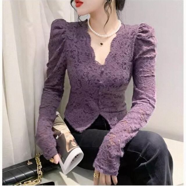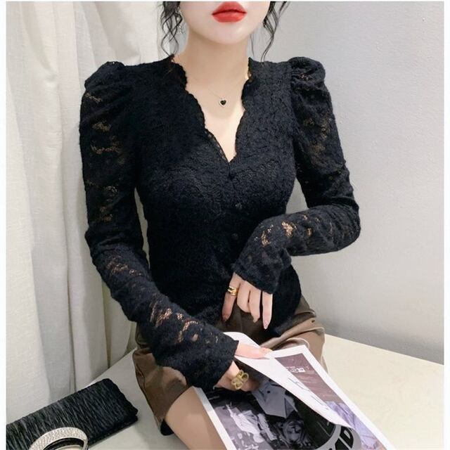 フリース裏地付き厚手Vネックレーストップス、春秋レディースファッション、若返りインナー、長袖トップス