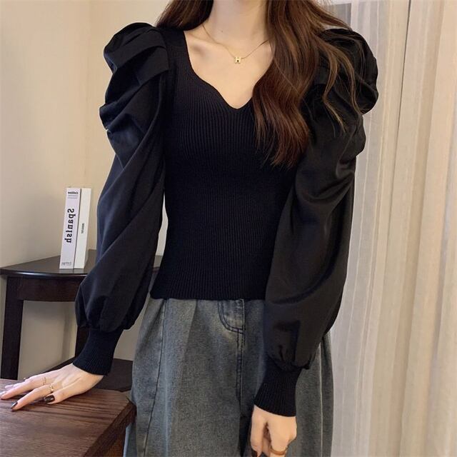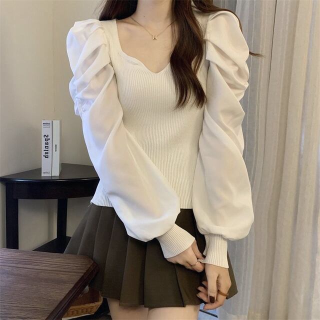 新作春秋レディースレトロバブル長袖ベースシャツ、ファッショナブルでエレガントなスクエアネックスリムフィットニットトップス