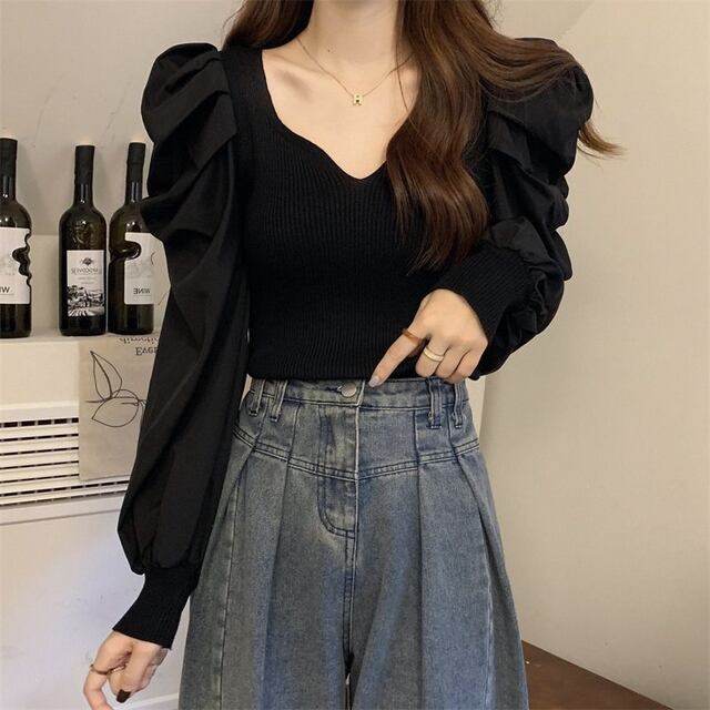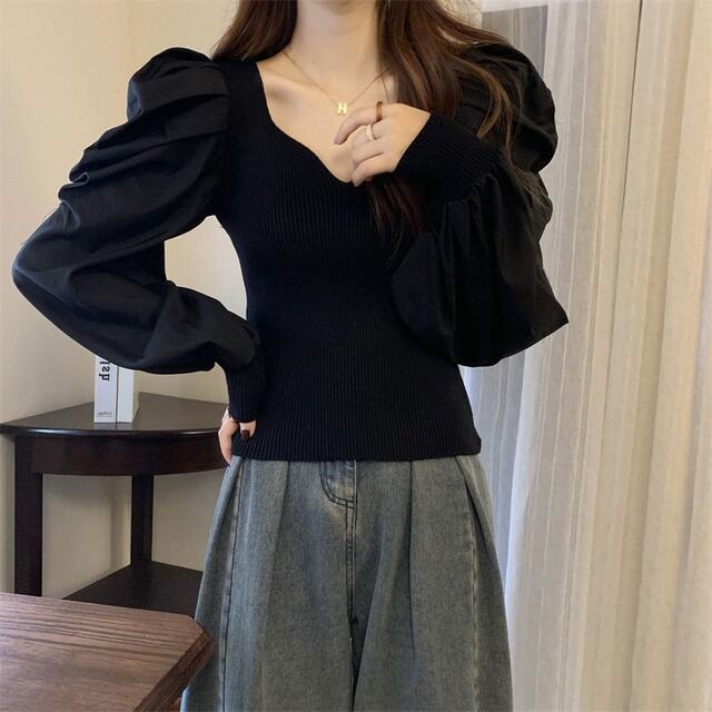 **2024年春秋新作!レディースレトロバブル長袖ベースシャツ、ファッショナブルでエレガントなスクエアネックスリムフィットニットトップス**