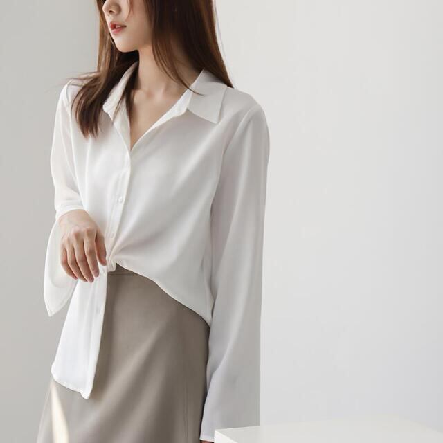 春秋にぴったりな、軽やかなシフォン素材の長袖ブラウスです!ユニークなフレア袖が特徴のこのブラウスは、シンプルながらも個性的なスタイルを演出します。
