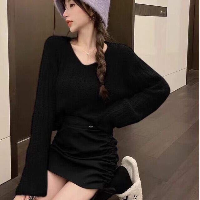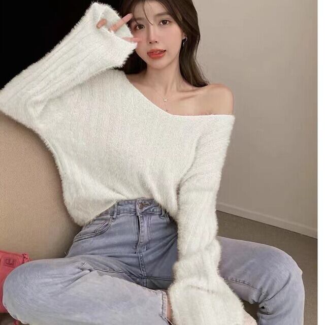 **2024年秋新作!フレンチスタイルのVネックゆったりフィットプルオーバーニットトップス、女性用万能ショートセーター**