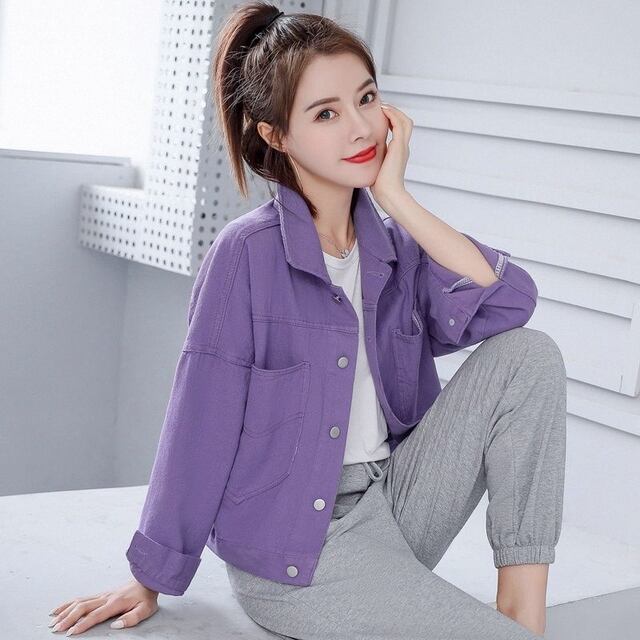2024年の春秋シーズンにぴったりな、女性用パープルデニムショートジャケットが新登場しました!カジュアルでありながら、どんなスタイルにも合わせやすい魅力的な一品です。