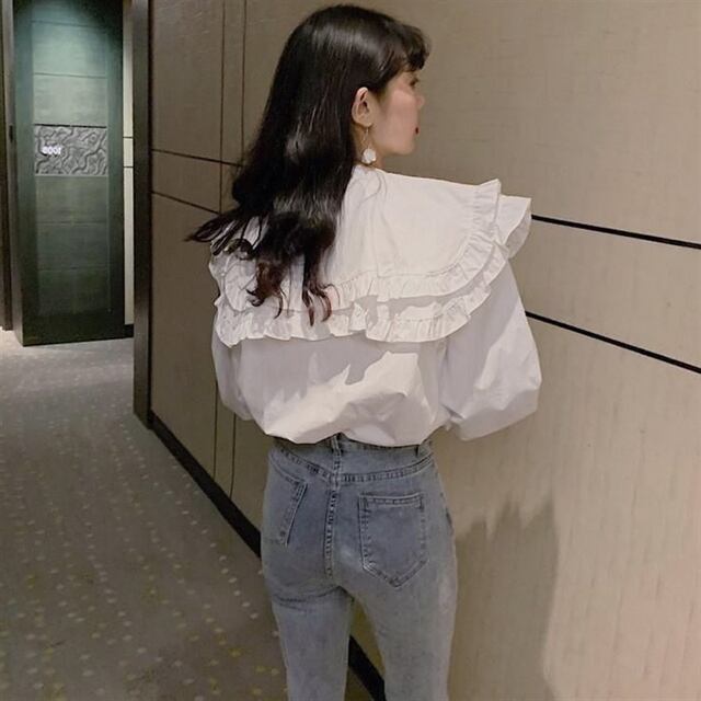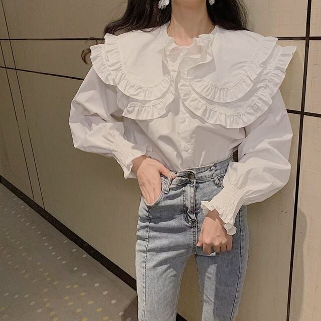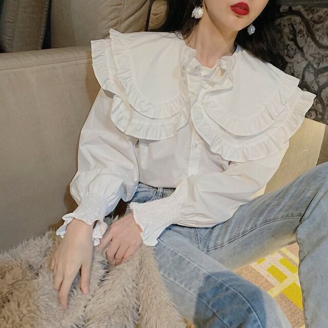このレトロなピーターパンカラーのフリルシャツをあなたのワードローブに加えて、春秋のファッションを存分に楽しんでいただければ幸いです!