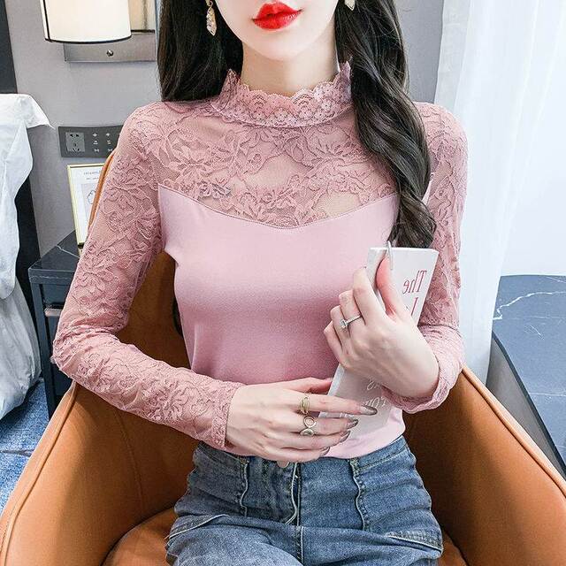 女性向けの新しいスタイリッシュなスタンドカラーのレースメッシュベースレイヤートップ。春秋向けの長袖スリムフィットインナーレイヤー、シックなトップス。