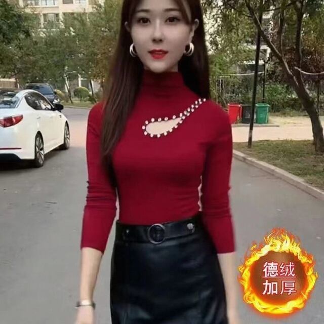 女性用暖かいフリースベースレイヤートップ、春秋新スタイル、厚手、スリムフィット、エレガント、ビーズ付きTシャツ。