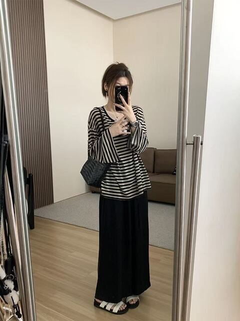 このストライプ長袖Tシャツは、ゆったりフィットとスリムフィットの2つのシルエットが選べ、どちらも女性らしさを引き立てます!さらりとした素材感が肌に心地よく、暑い日でも快適に着用できる点が魅力です。デニムやショートパンツ、スカートと合わせて、カジュアルな夏のコーディネートを楽しむことができます。このTシャツを着て、夏のファッションを存分にお楽しみください!