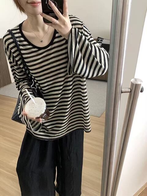 **2025年夏新作!プラスサイズレディース服、爽やかなストライプデザインの長袖Tシャツで夏を彩るカジュアルトップス!**