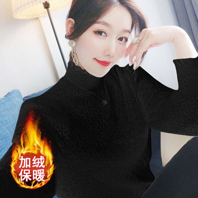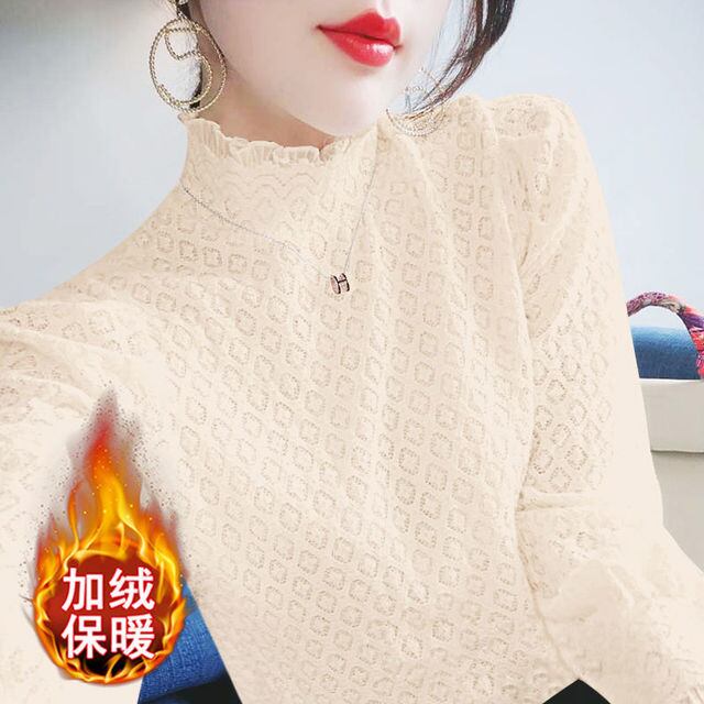 薄手/フリース裏地付きレースベースレイヤートップ(レディース)、2020年秋冬新作、ヨーロピアンスタイル、シックなハイネックトップス/Tシャツ