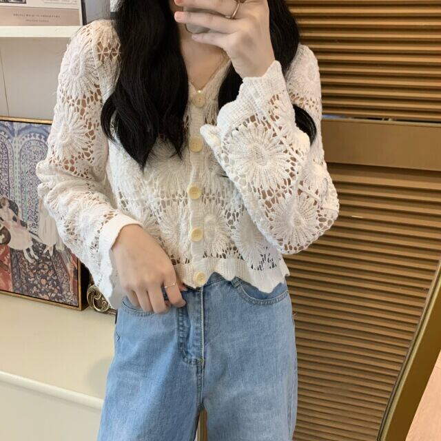 2025年春秋新作 ファッショナブルでエレガントな刺繍レース透かし彫り長袖カーディガンジャケット レディース服 スタイリッシュなショートトップス