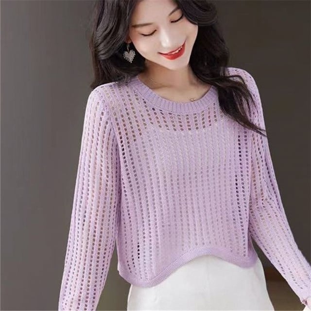 女性向けの新スタイルの長袖Tシャツ、ファッショナブルでスタイリッシュな透かし彫りの薄手ニットカーディガン、小柄な女性向けのショート丈トップス。