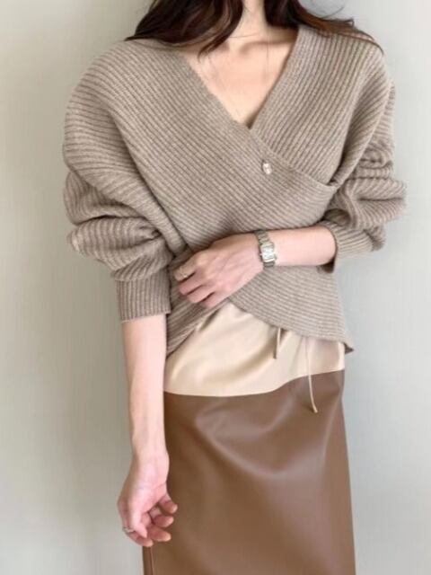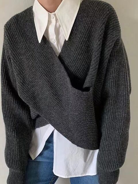 **2025年秋新作!おしゃれで着回しの効く無地 Vネック クロスオーバー 長袖 プルオーバー ニット セーター トップスで、洗練されたコーディネートを楽しもう!**