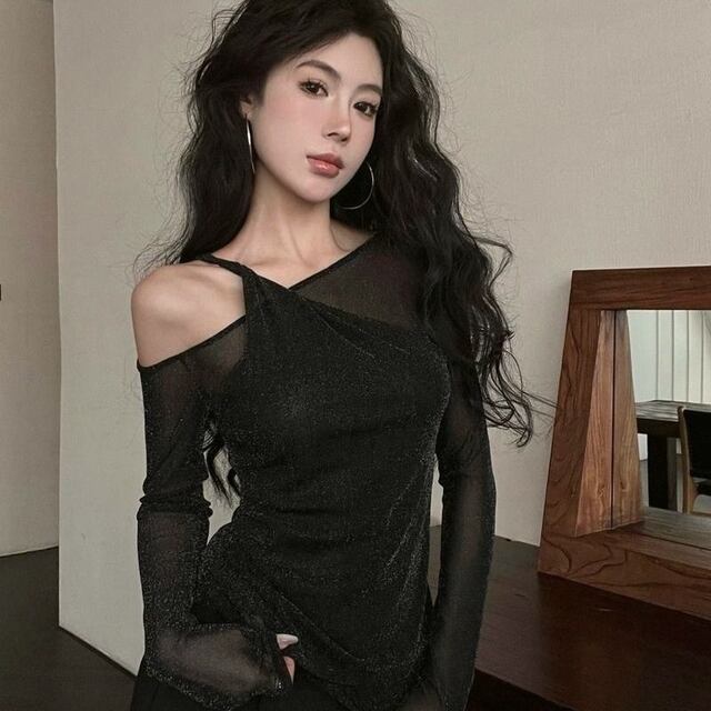 ワンショルダーレースシースルートップ、長袖Tシャツ、新作レディース服、スリムフィット、セクシースタイル、春秋服、キラキラ。
