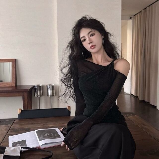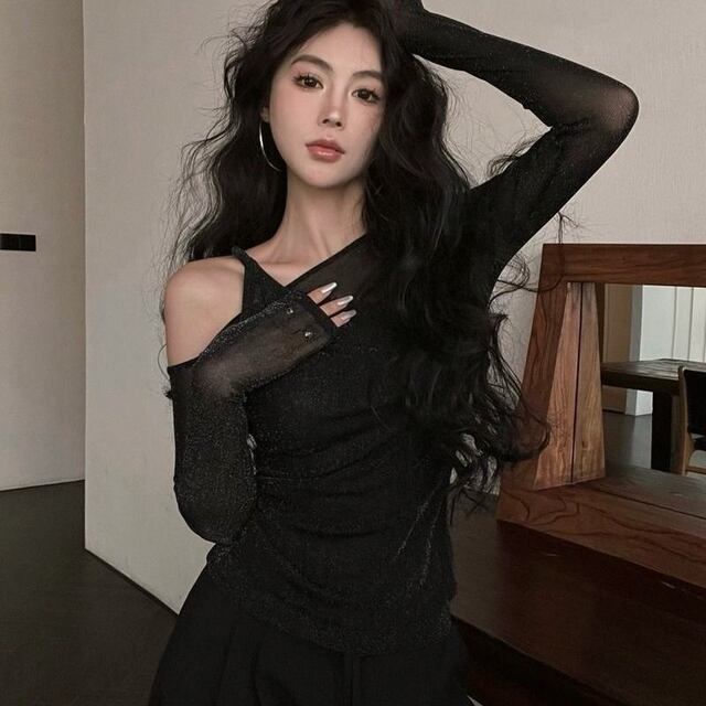 **2024年新作!魅惑的なワンショルダーレースシースルートップで、春秋のセクシースタイルを楽しもう!**