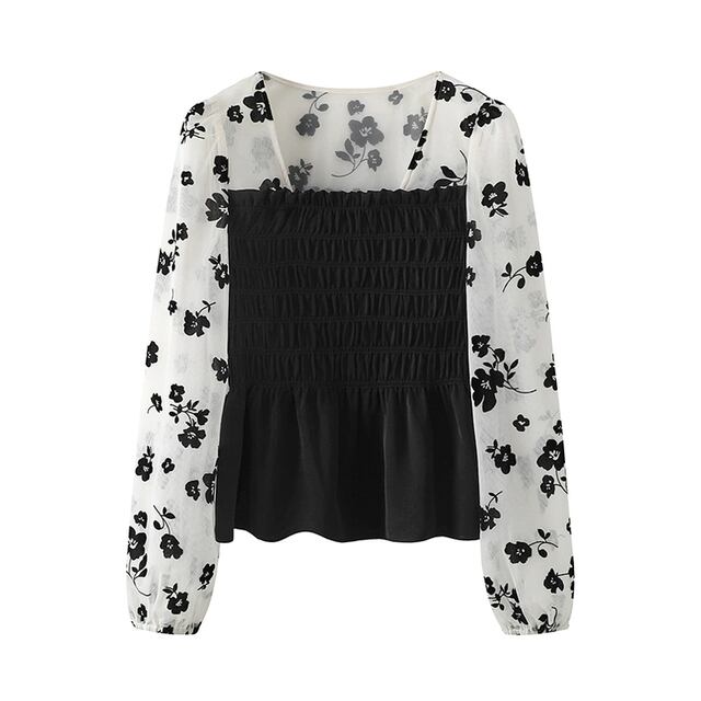 1-10 レディース 春秋新作 フレンチレトロ 花柄シフォンシャツ、カラーブロック スリムフィットトップス