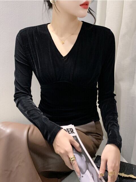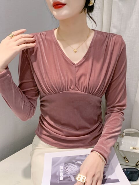**2024年春秋新作!ヨーロピアンスタイルなベルベットプリーツVネックTシャツで、上品な日常を楽しもう!**