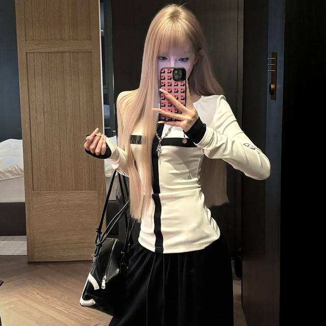 ピュアで魅惑的なカラーブロックの長袖Tシャツ。秋冬の新作スタイル、スリムフィット、ハイストリート系の人気ガールズ向けベースレイヤートップ。