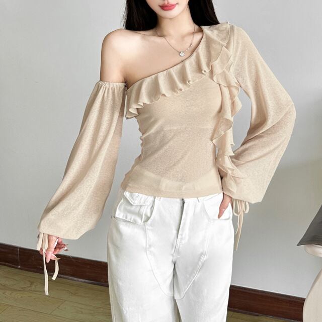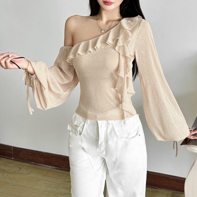 欧米スタイル 2025年秋新作 レディース服 ワンショルダー フリル アシンメトリー フリル ランタンスリーブ スリムトップ