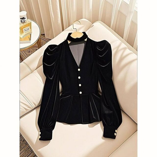 このシャネル風の黒ベルベット長袖シャツで、春秋のファッションを心ゆくまで楽しんでいただければ幸いです!