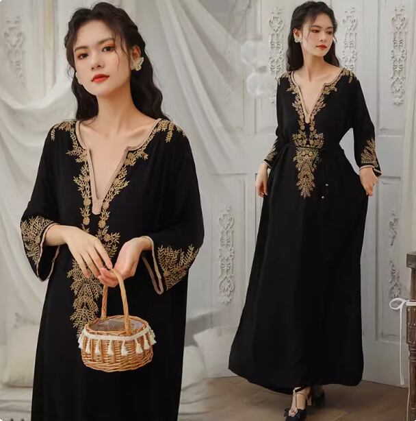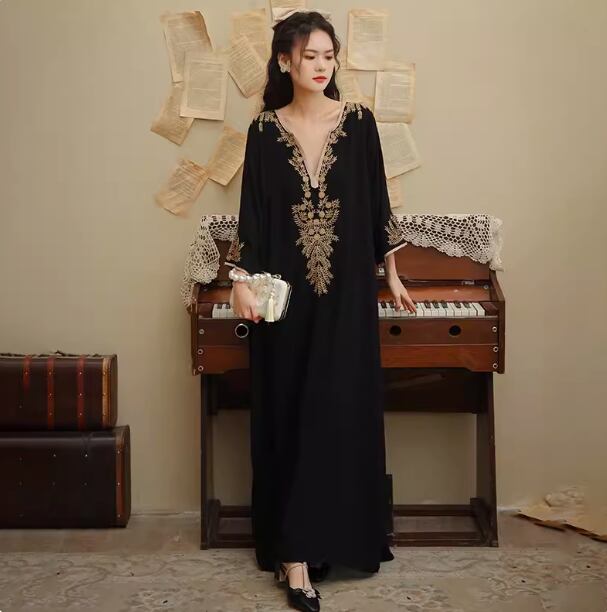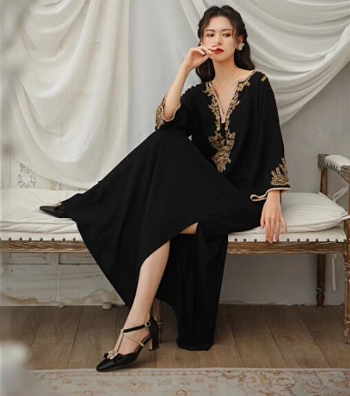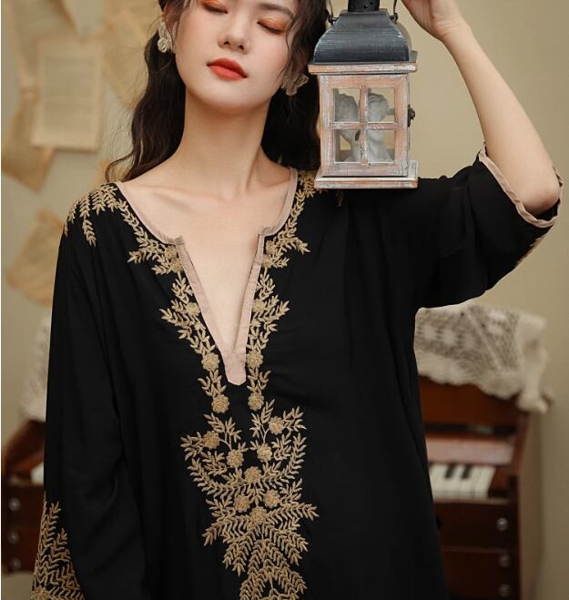VネックとAラインの組み合わせで、女性らしいシルエットを演出します。ウエストマークでメリハリをつけ、スタイルアップも叶います。さらっとした薄手のシフォン素材なので、夏の暑い日でも涼しく快適に着られます。おしゃれでかっこいい、エスニックでエキゾチックなスタイルを演出したい方にぴったりです。