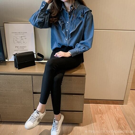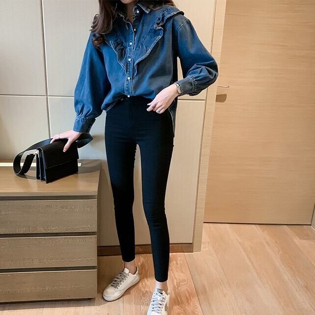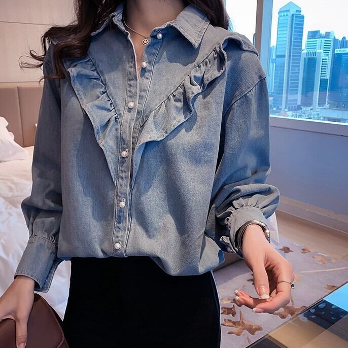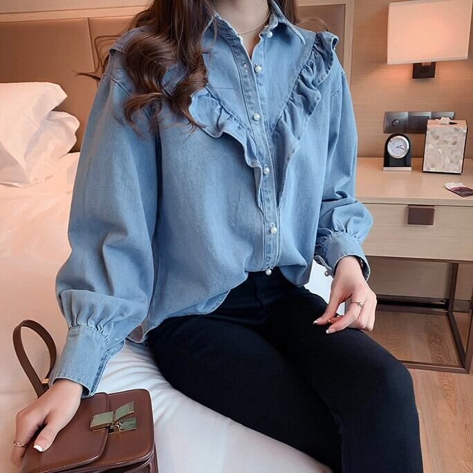 レディース トップス シャツ 羽織 デニムシャツ ミディアム 長袖 ポロカラー ストレート フリル ボタン かわいい 大人可愛い きれいめ シンプル カジュアル おしゃれ レトロ こなれ感 ラフ ガーリー ルーズ ラブリー キュート 学生風 ナチュラル 無地 春 秋 通勤 学生 学校 通学 デート お出かけ 女子会 ショッピング カフェ 韓国 コーデ 楽ちん 体型カバー 脚長 普段使い 着回し モテ トレンド 流行 インスタ映え M L XL 2XL 3XL 4XL 大きいサイズ ブルー ライトブルー