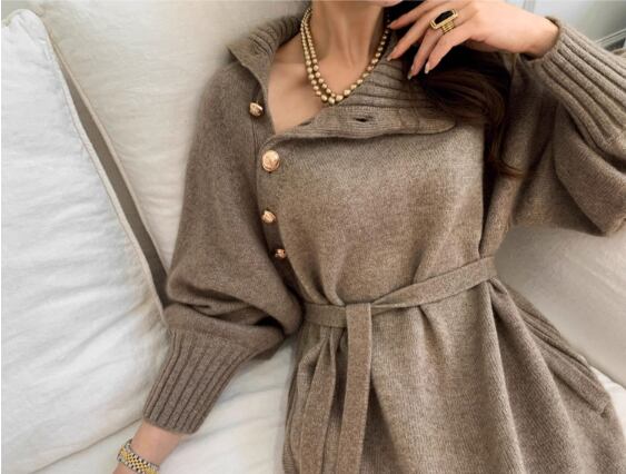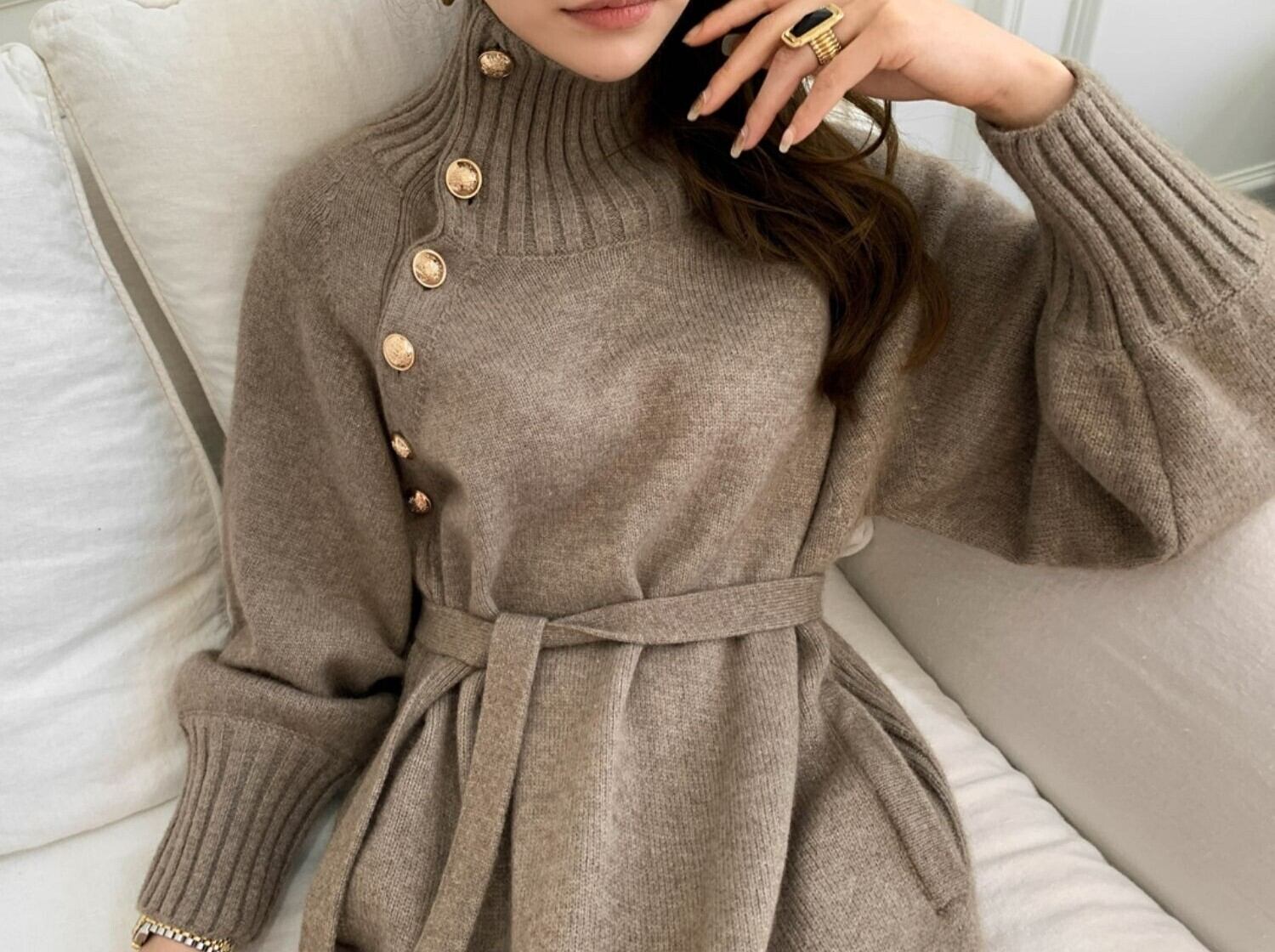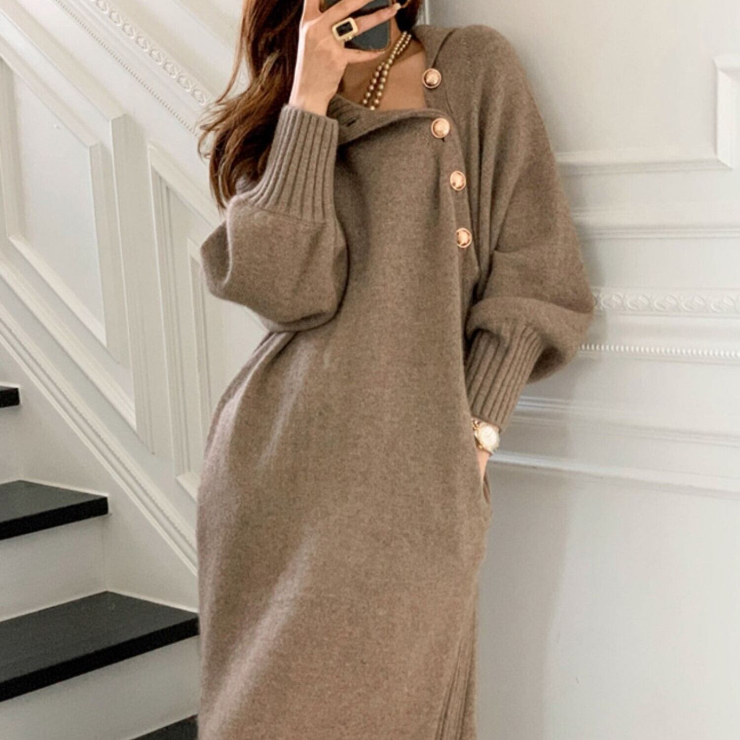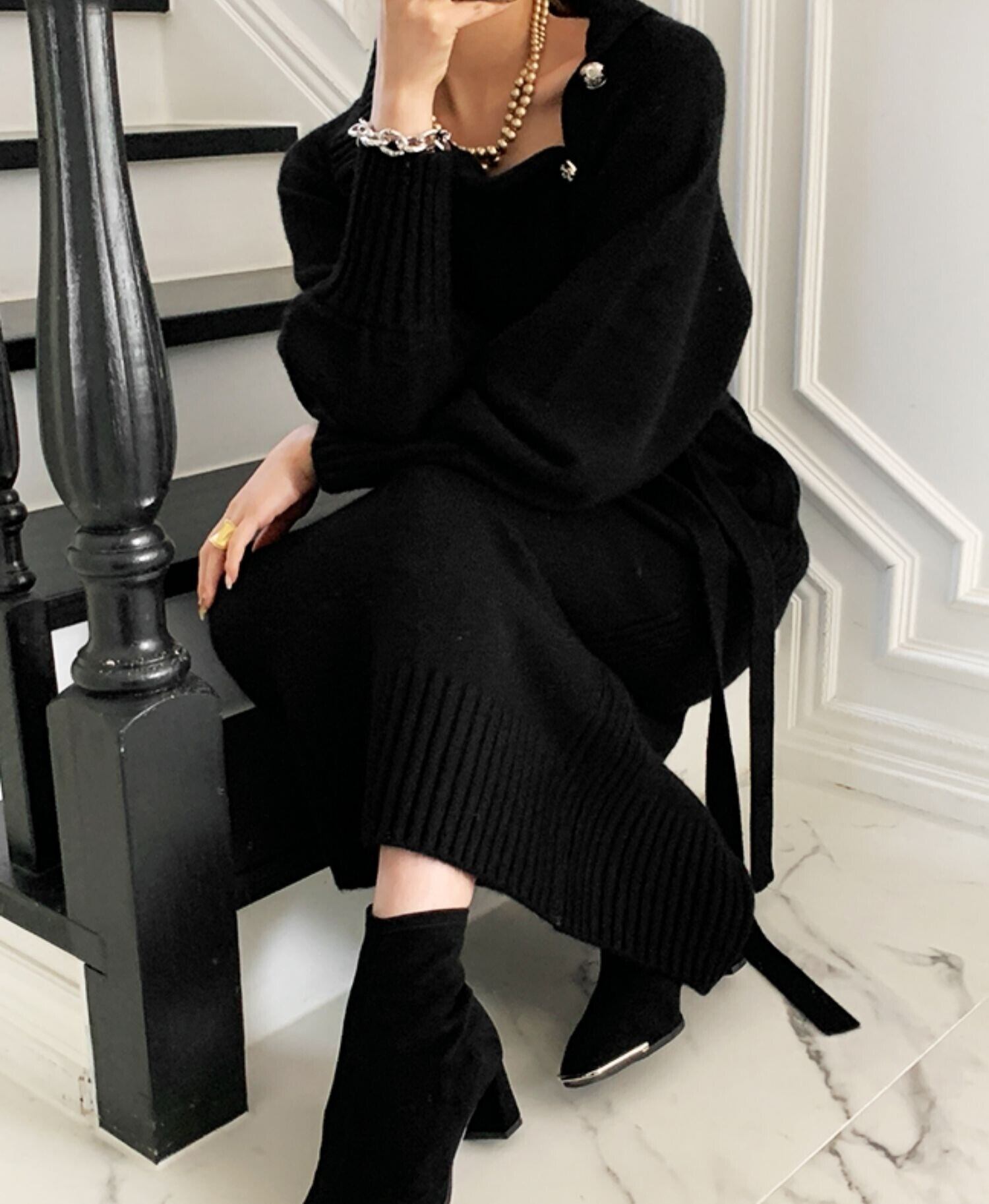 ボタンがアクセントでエレガントな雰囲気を演出してくれる、ニットロングワンピース。