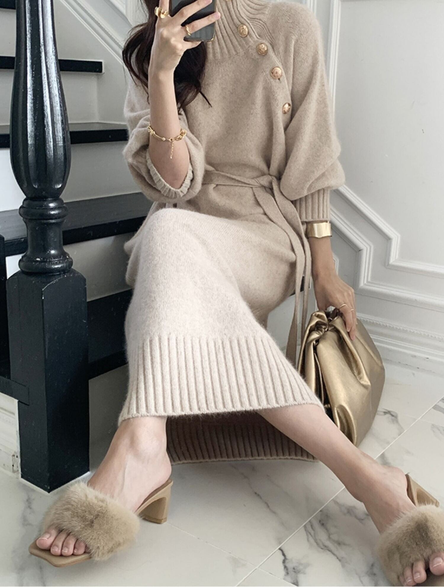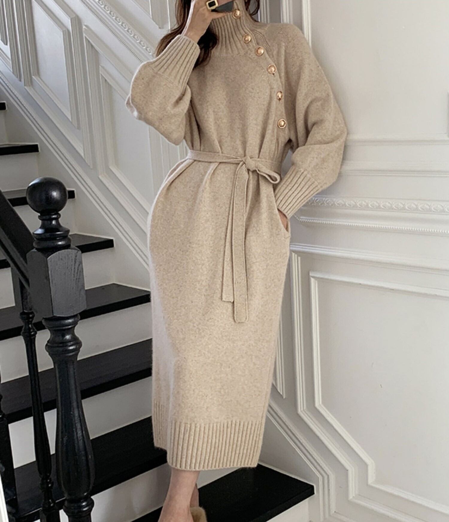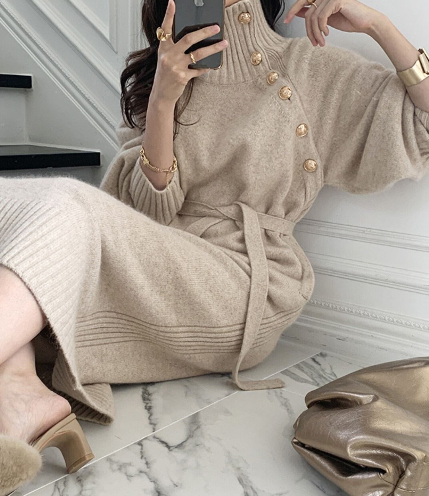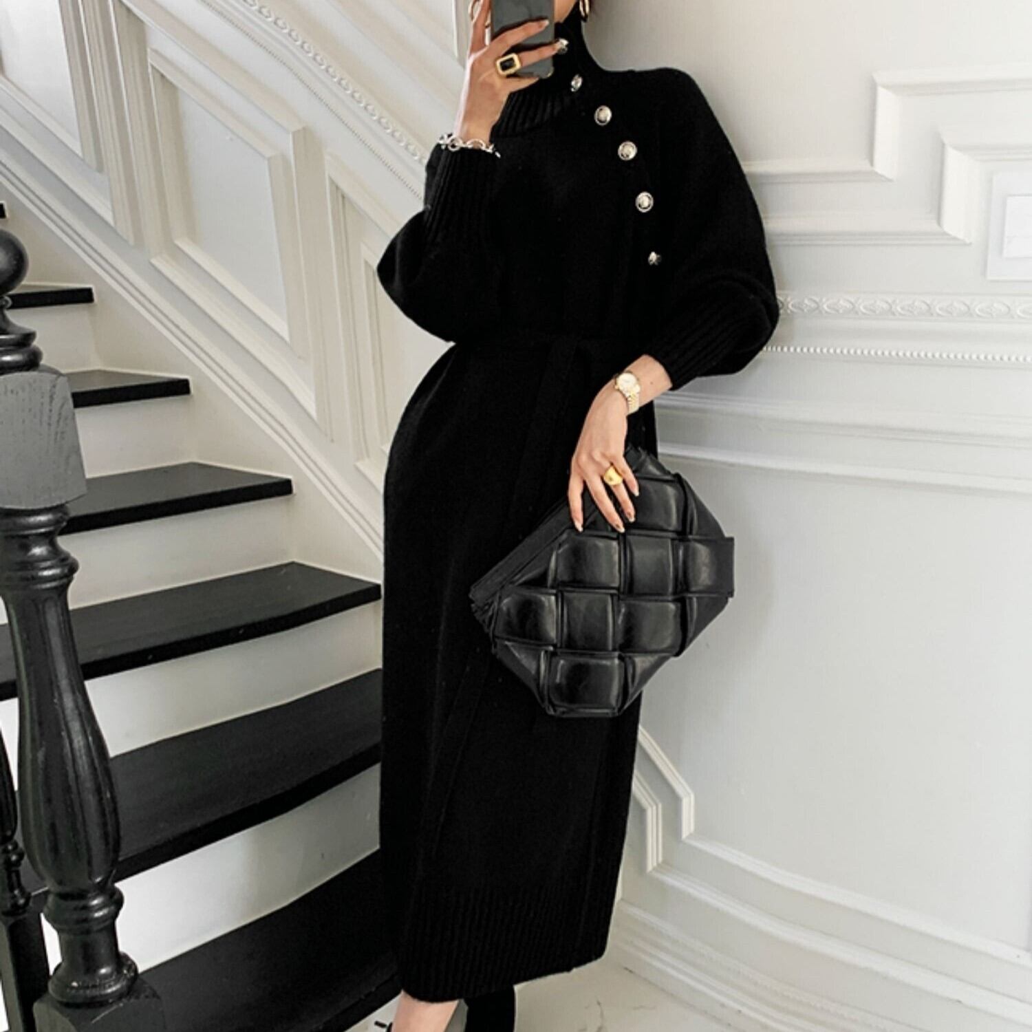 ボタンがアクセントでエレガントな雰囲気を演出してくれる、ニットロングワンピース。