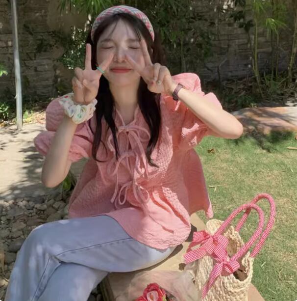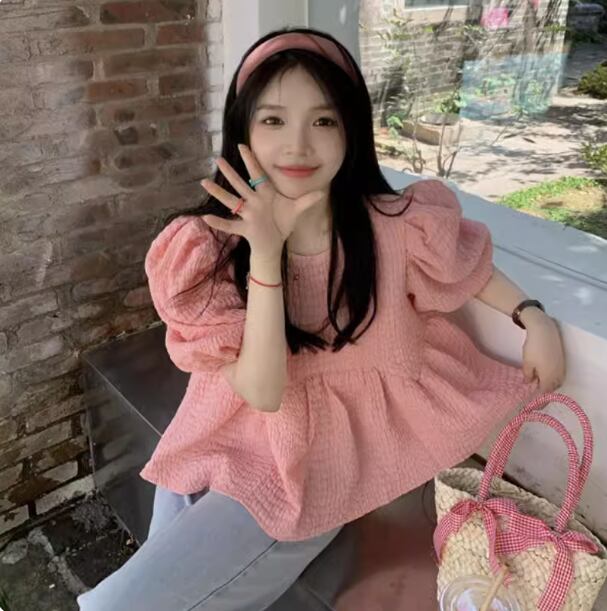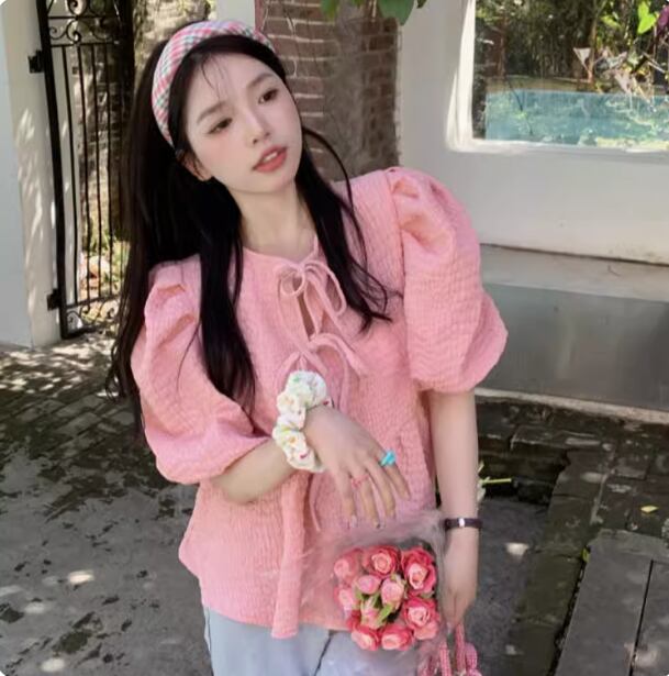 ブラウス レトロ パフスリーブ 半袖 ミディアム 半袖 パーティースタイル ホームパーティーアイテム オフィススタイル エレガントスタイル カジュアルスタイル ボリューム袖 謝恩会 ラウンジウェア レディース トップス かわいい 大人可愛い きれいめ シンプル カジュアル 春 夏 秋 コーデ 楽ちん 普段使い 着回し ピンク S M L XL