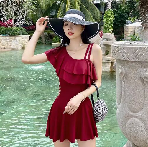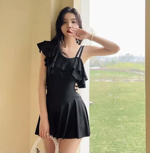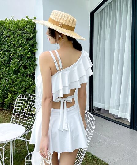 ハイウエストのデザインで、胸元にはフリルがあり、ワンショルダーとなります。