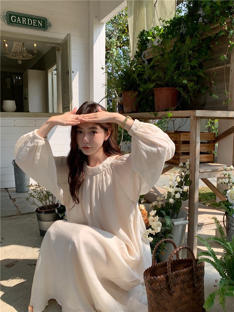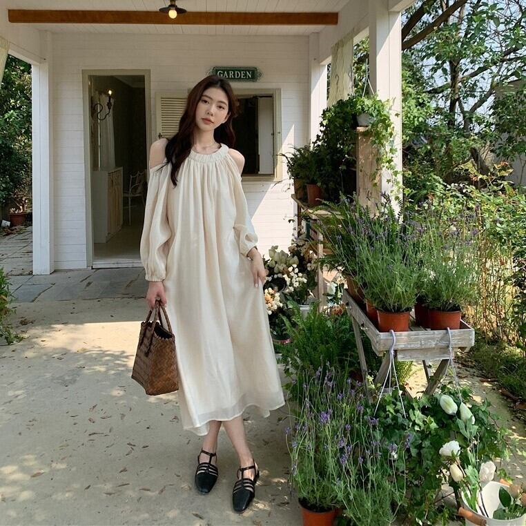 レディース ワンピース プルオーバー ドレス ロングスカート ロング 肩出し ランタンスリーブ ラウンドネック 細身 Aライン フェミニン フリル かわいい 大人可愛い きれいめ シンプル カジュアル 上品 おしゃれ レトロ ガーリー エレガント ラブリー キュート ナチュラル 無地 春 秋 謝恩会 結婚式 二次会 デート お出かけ パーティー イベント 女子会 ショッピング カフェ 韓国 コーデ 楽ちん 普段使い 着回し モテ トレンド 流行 インスタ映え S M L ゆったり ゆる アプリコット
