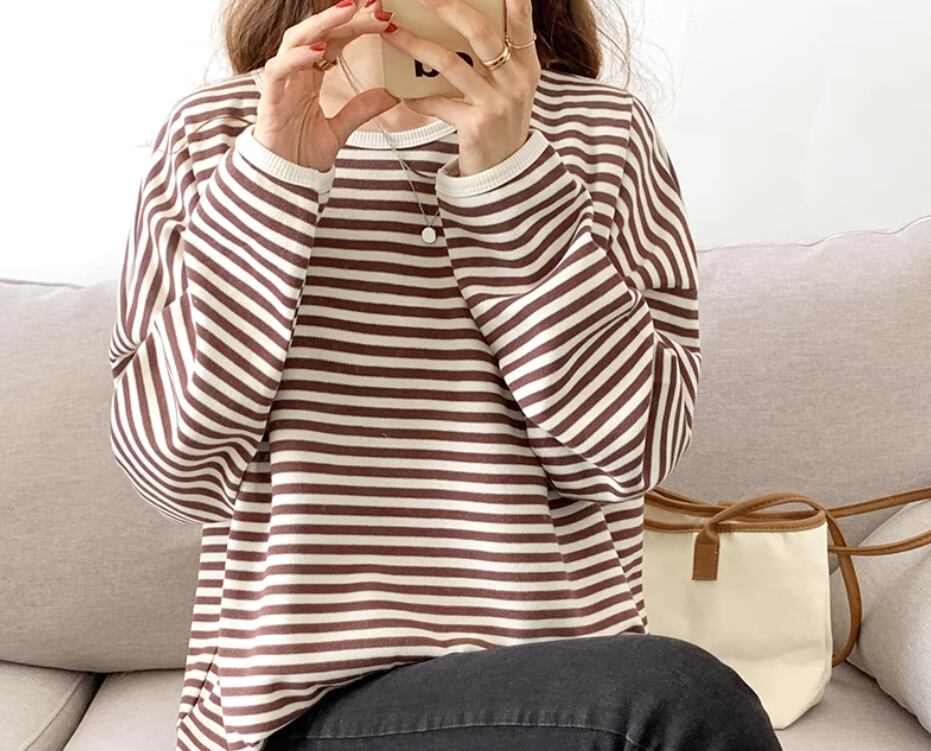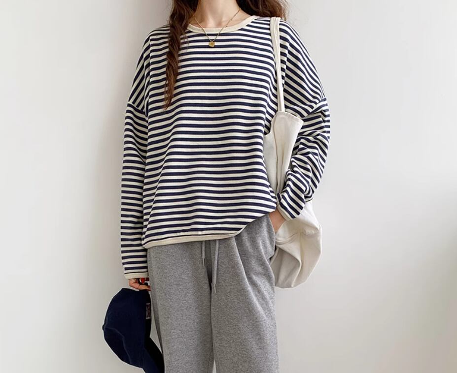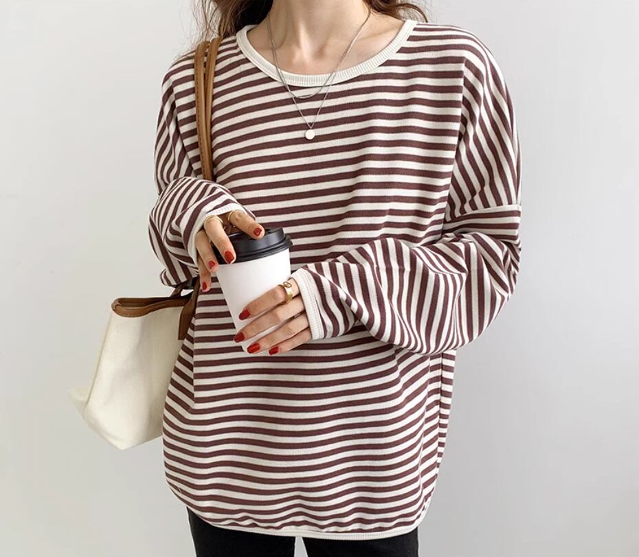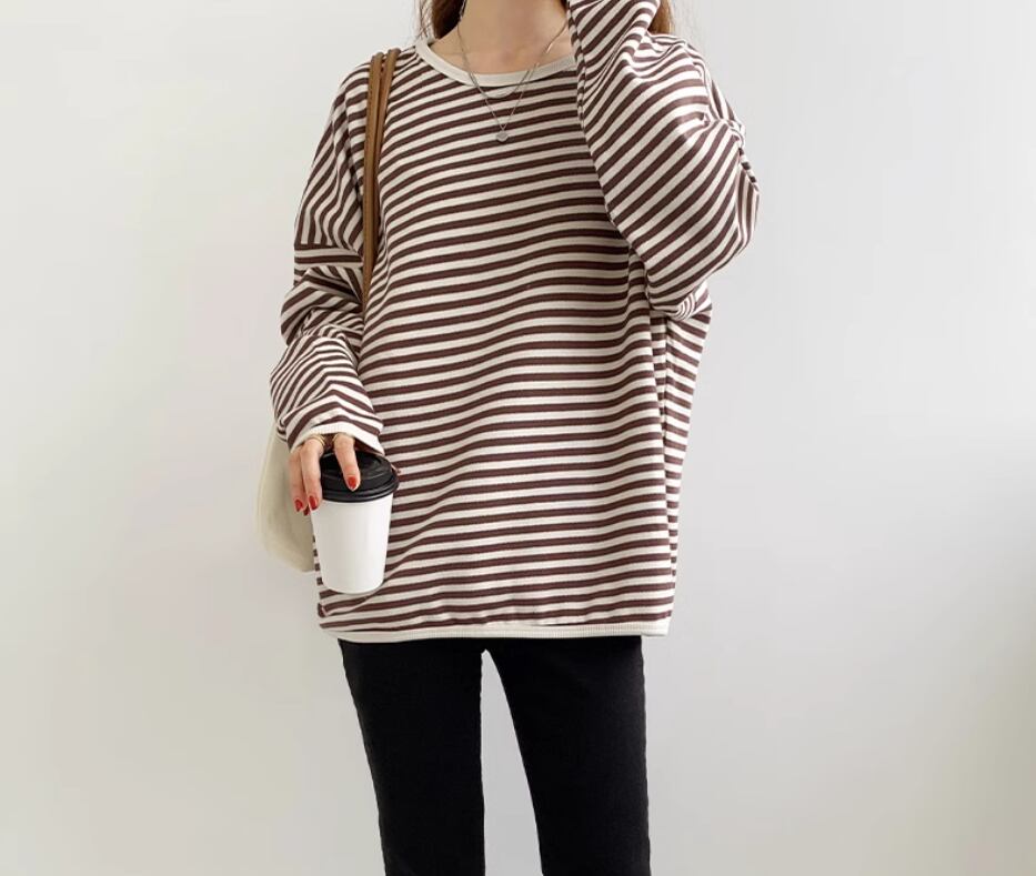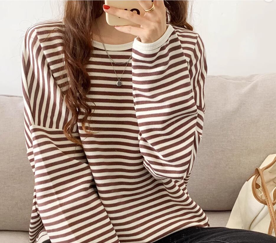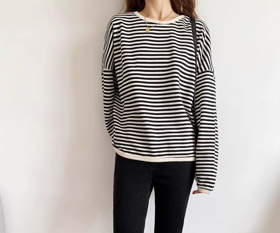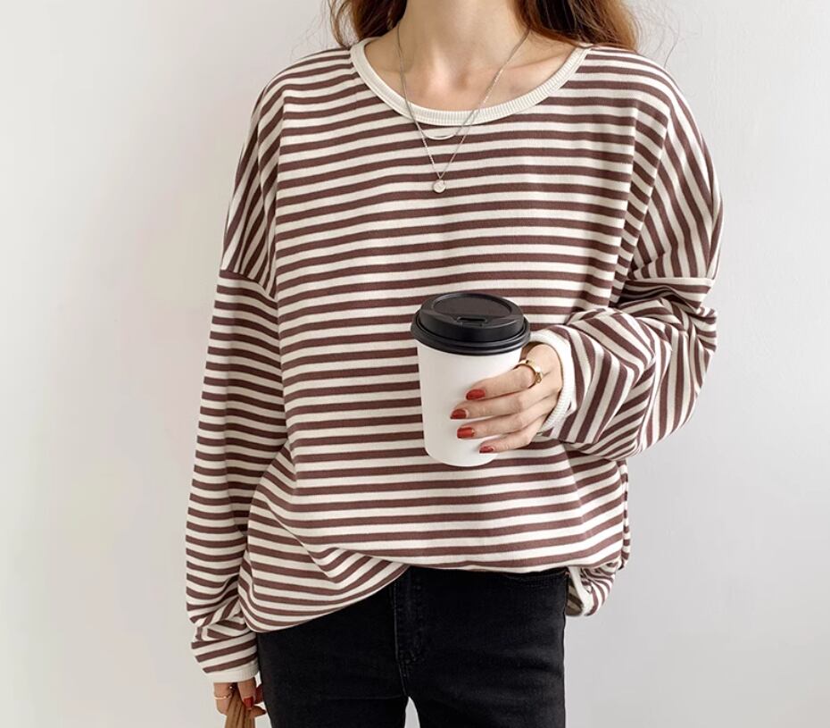 ボーダートップス カットソー 袖あり 長袖 ドロップショルダー ラウンドネック 伸縮性 かわいい カジュアル ボーダー 春 秋 冬 10代 20代 30代 40代 レディース 女性用 ママ お出かけ 休日 旅行 着回し 普段使い 楽ちん 体型カバー 定番 S M L ゆったり 黒 ブラック 茶色 ブラウン ネイビー