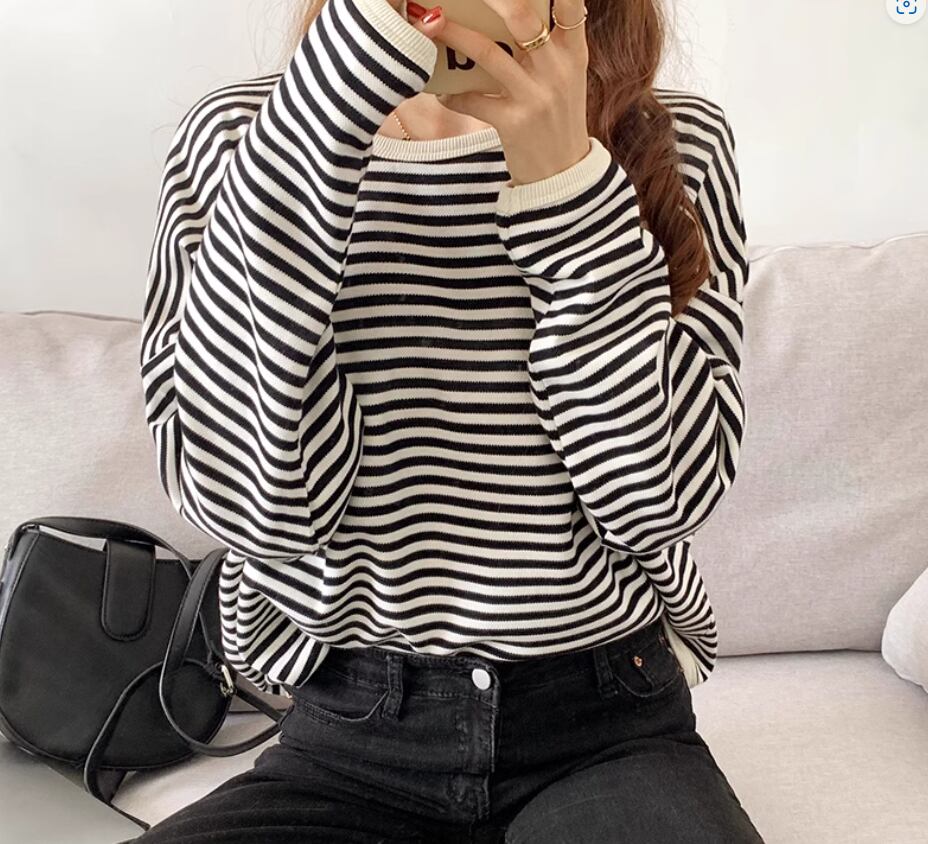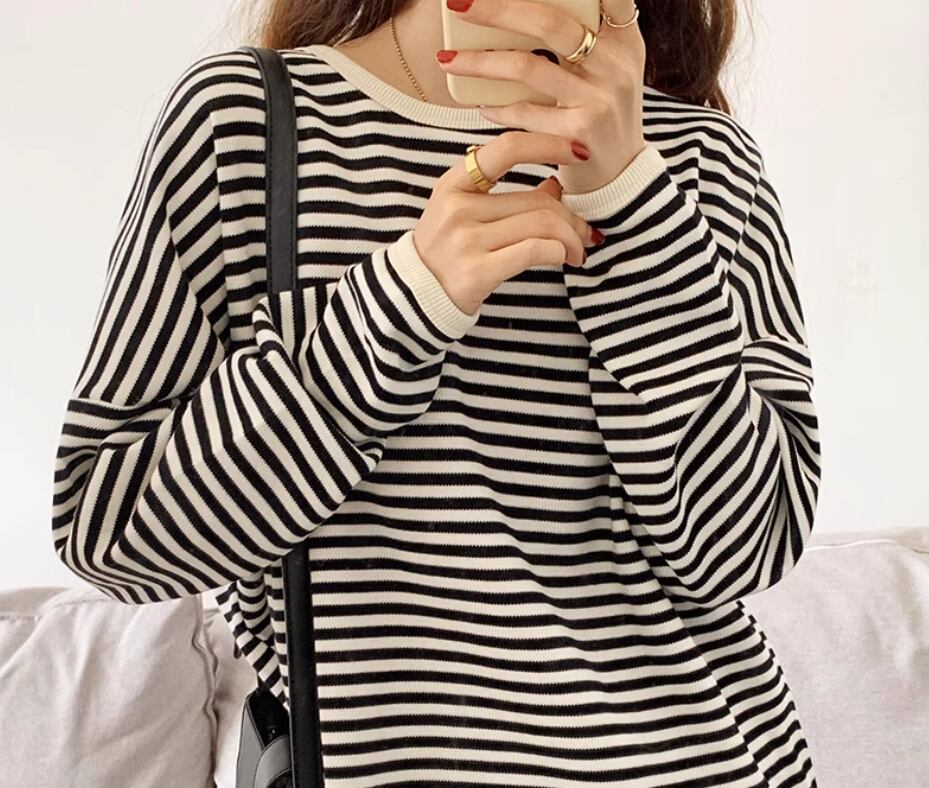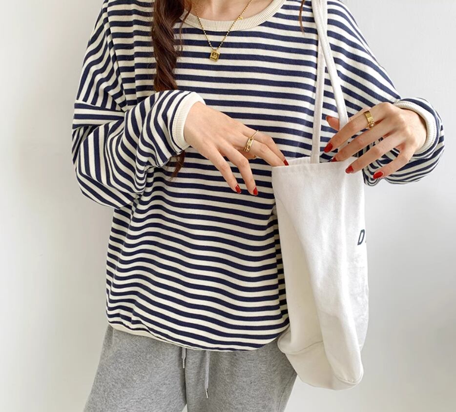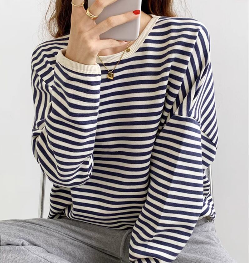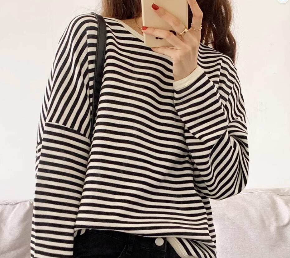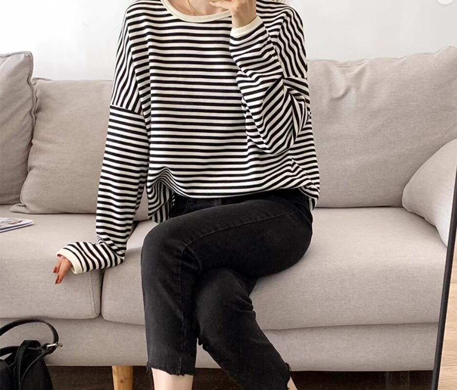 ボーダートップス カットソー 袖あり 長袖 ドロップショルダー ラウンドネック 伸縮性 かわいい カジュアル ボーダー 春 秋 冬 10代 20代 30代 40代 レディース 女性用 ママ お出かけ 休日 旅行 着回し 普段使い 楽ちん 体型カバー 定番 S M L ゆったり 黒 ブラック 茶色 ブラウン ネイビー