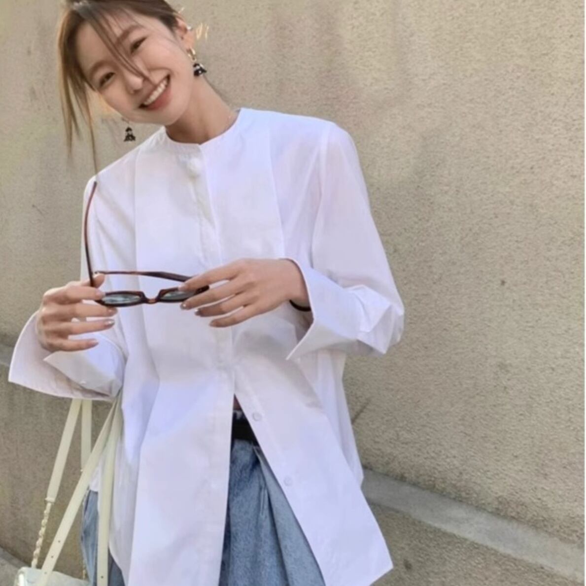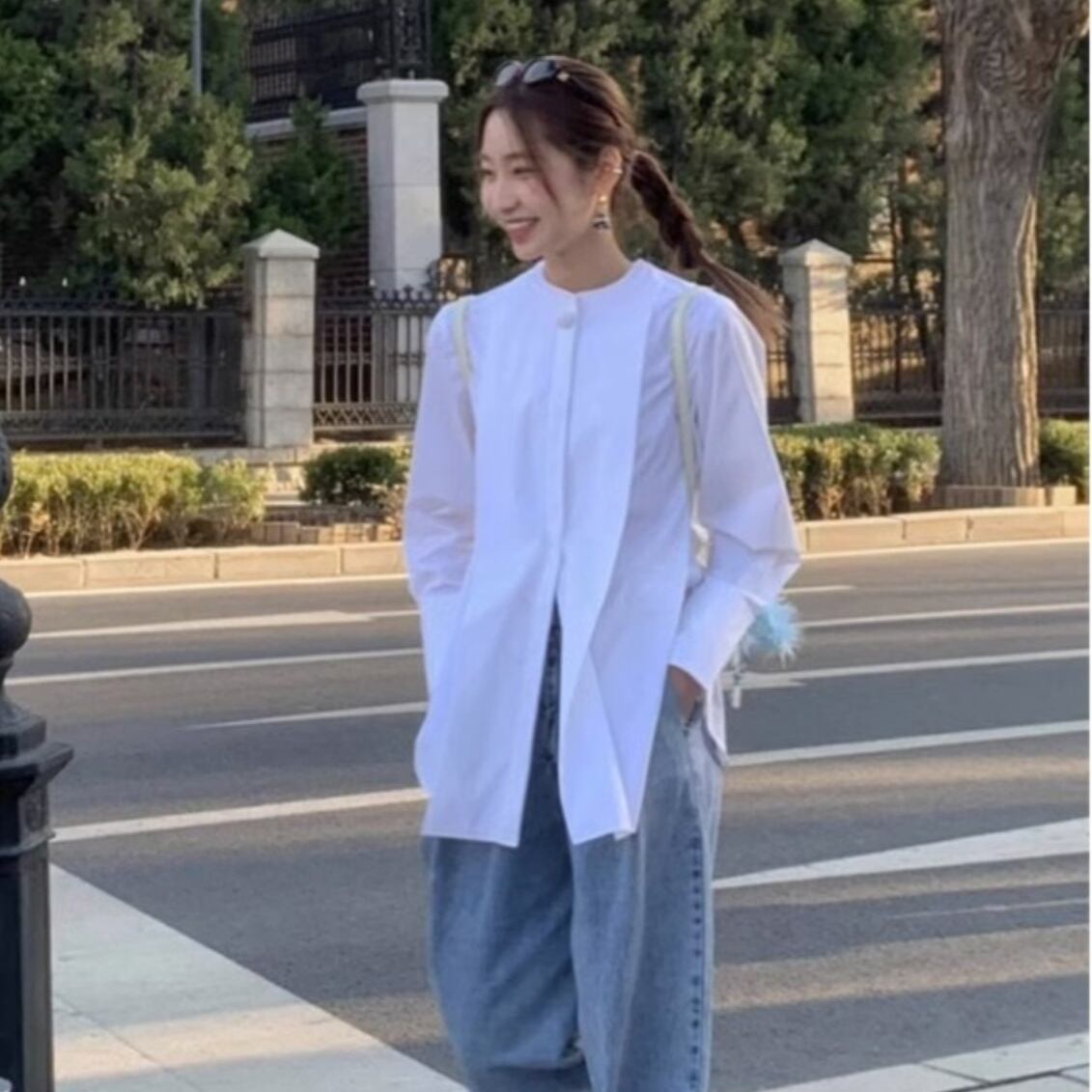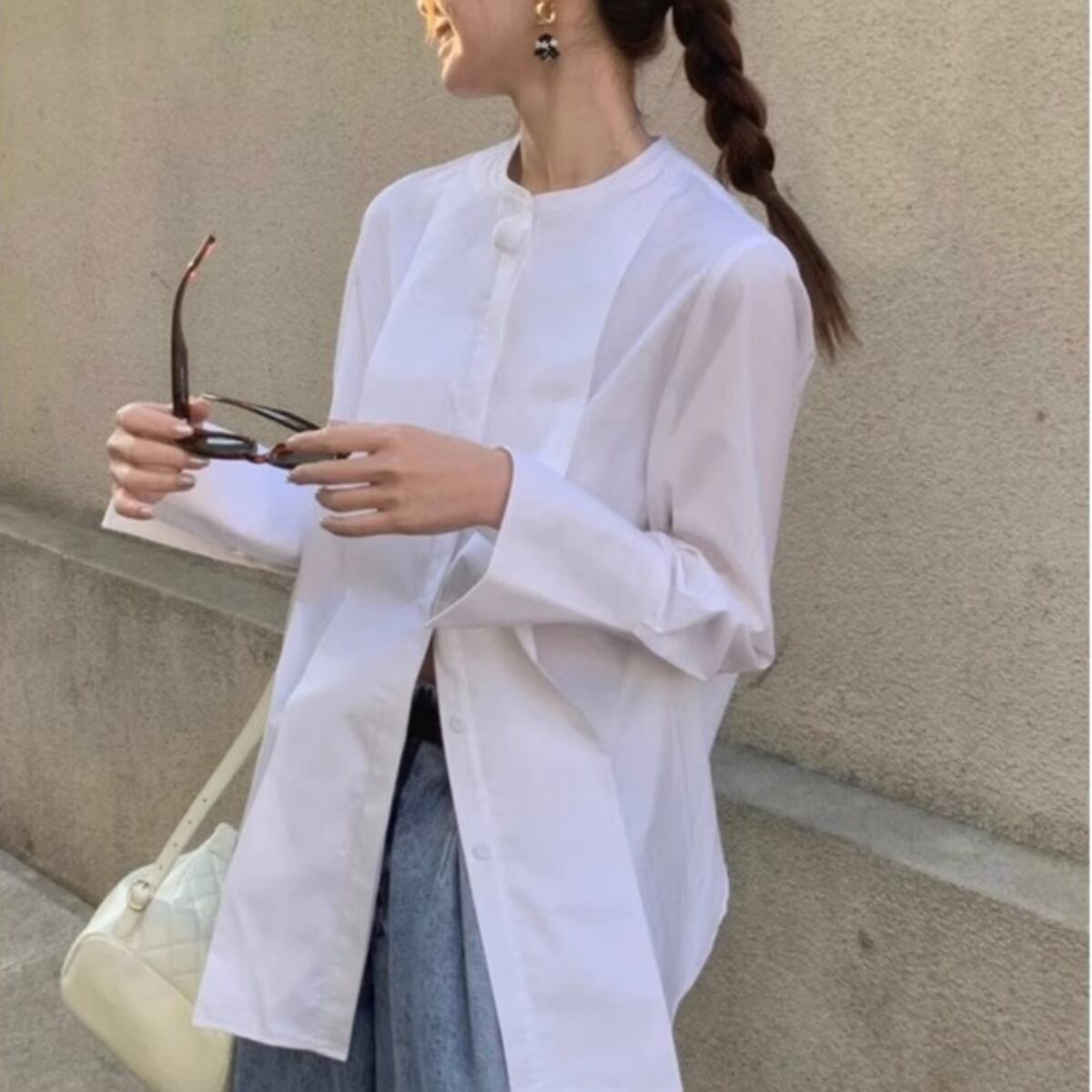 トップス シャツ 白シャツ ミディアム丈 長袖 襟なし 前開き ボタン かわいい 大人可愛い きれいめ シンプル 上品 おしゃれ かっこいい レトロ こなれ感 個性的 主役級 存在感 抜け感 オールシーズン キュート ナチュラル ベーシック メンズライク 清楚 クール フォーマル 無地 レディース 女性用 ママ OL 通勤 オフィス ビジネス 学生 通学 デート お出かけ お泊まり イベント 女子会 休日 カフェ ショッピング レストラン コンパ レイヤード 重ね着 普段使い 着回し S M L XL