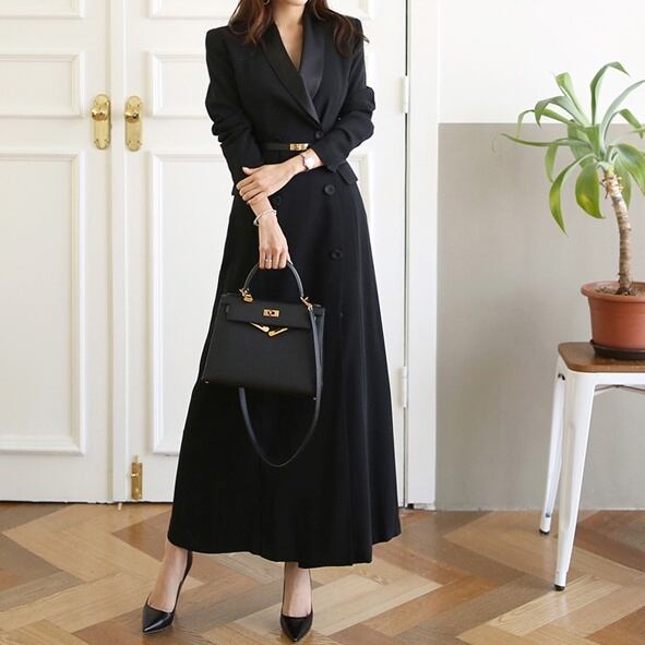 シックで上品な雰囲気漂う、Vネックとウエストベルトがおしゃれなロングワンピース。