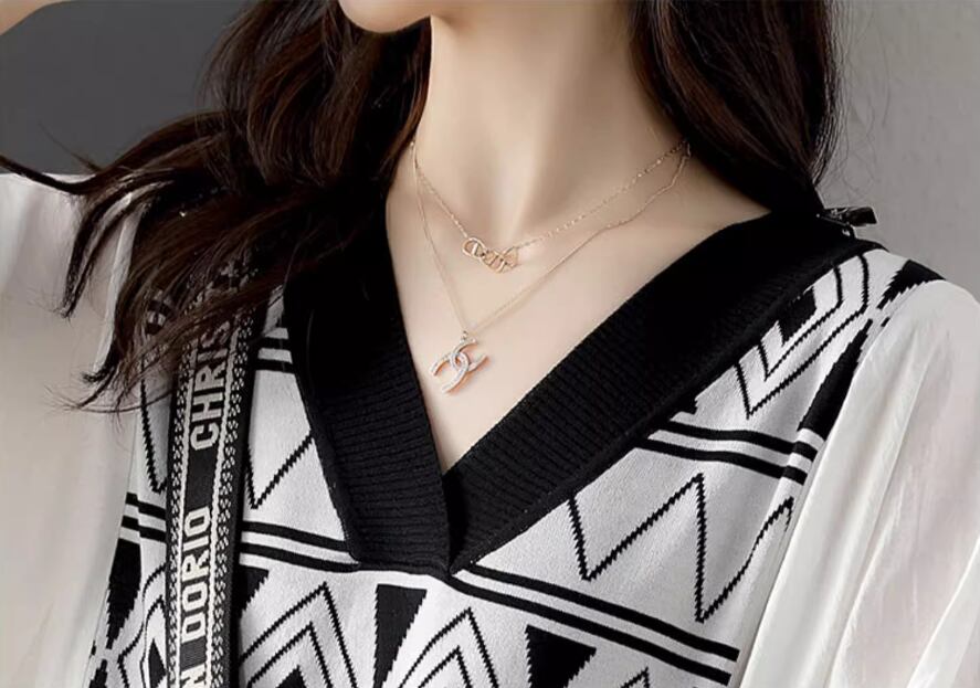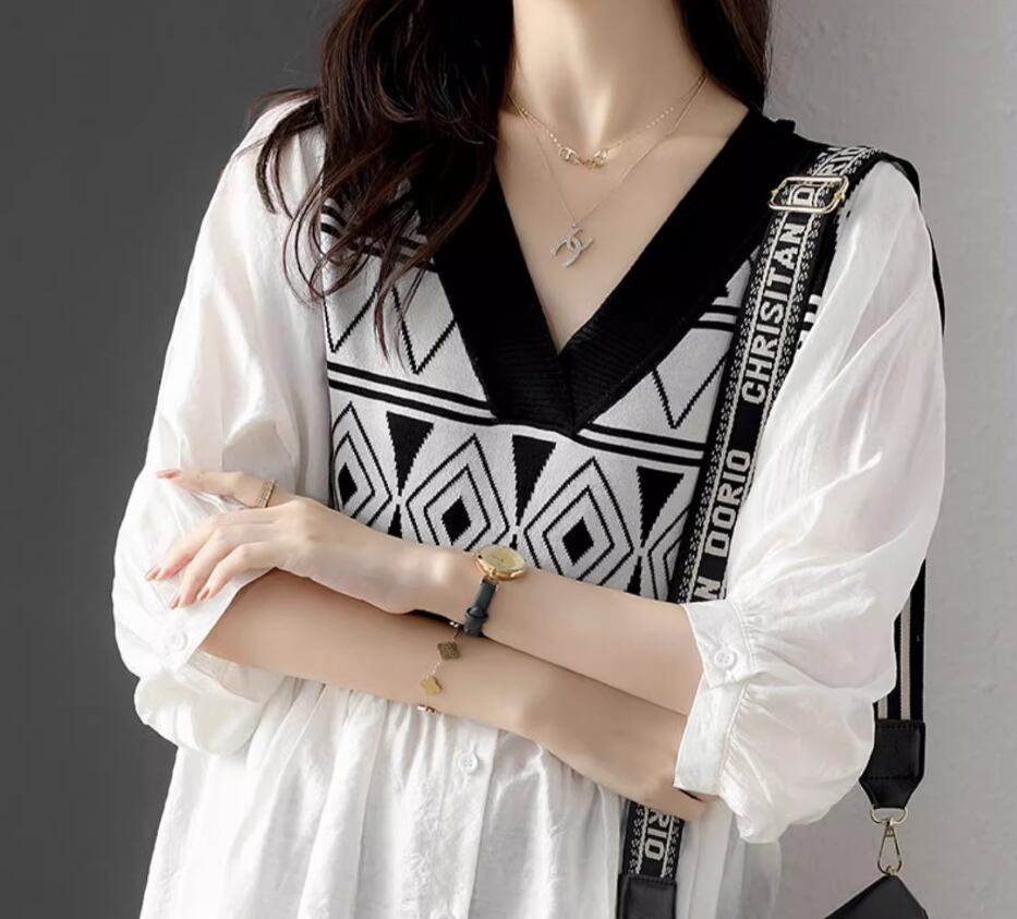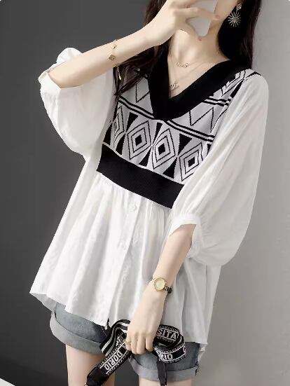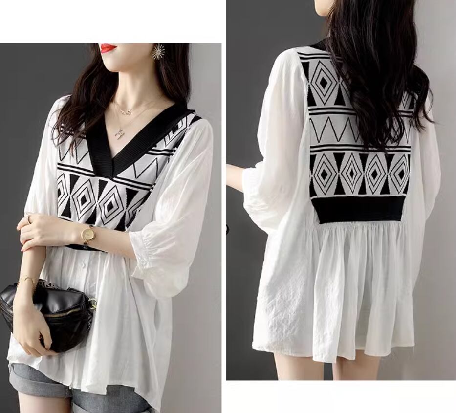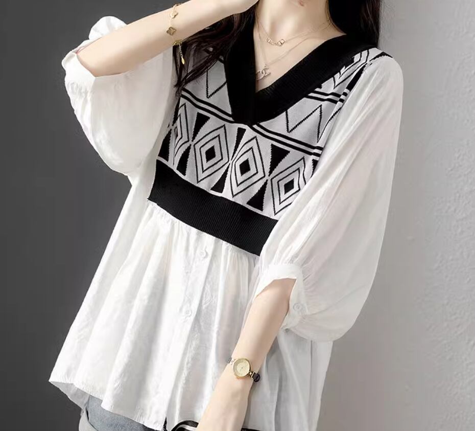 ニット×シャツのドッキングデザインがおしゃれなVネックトップス