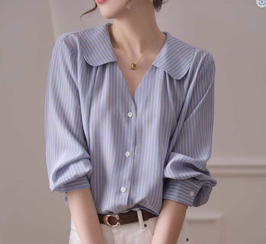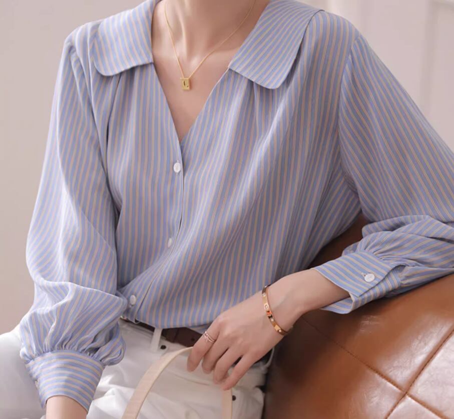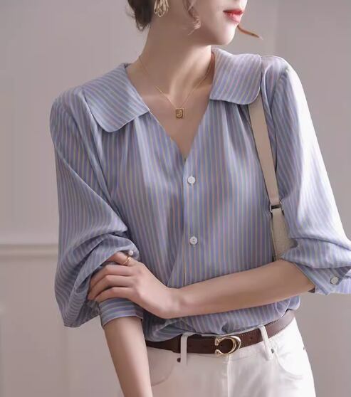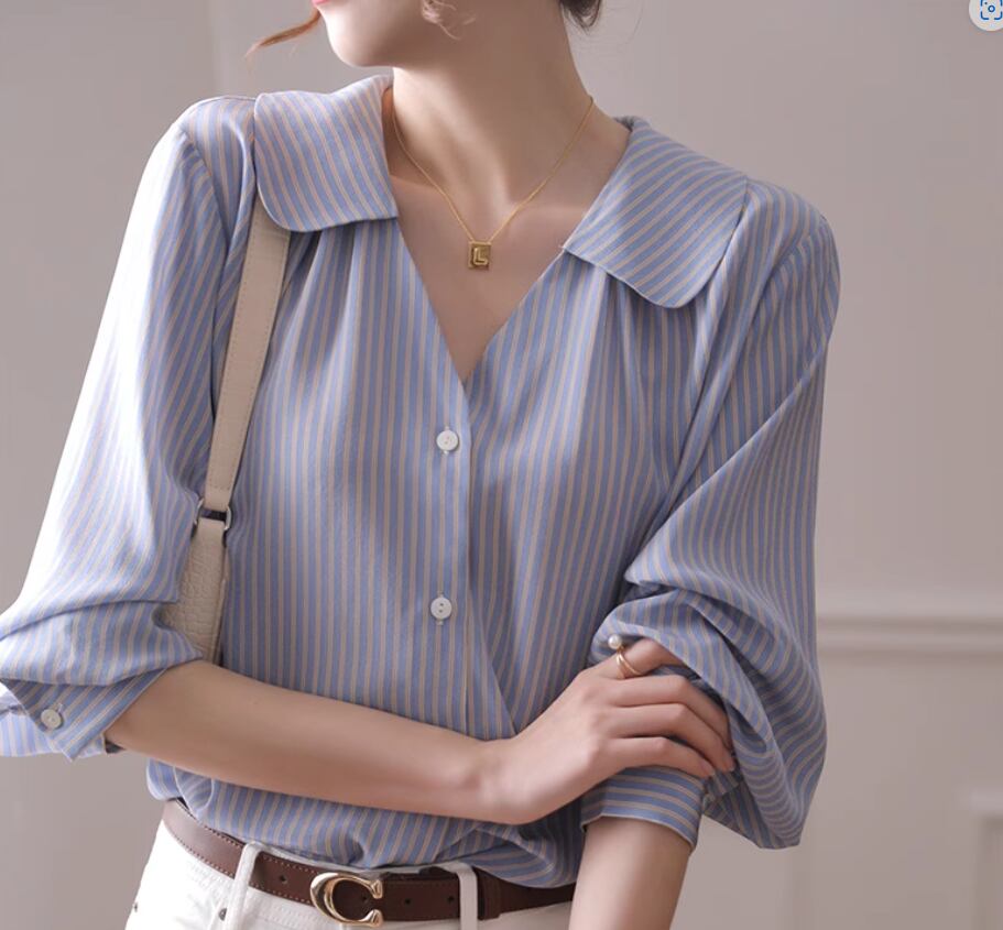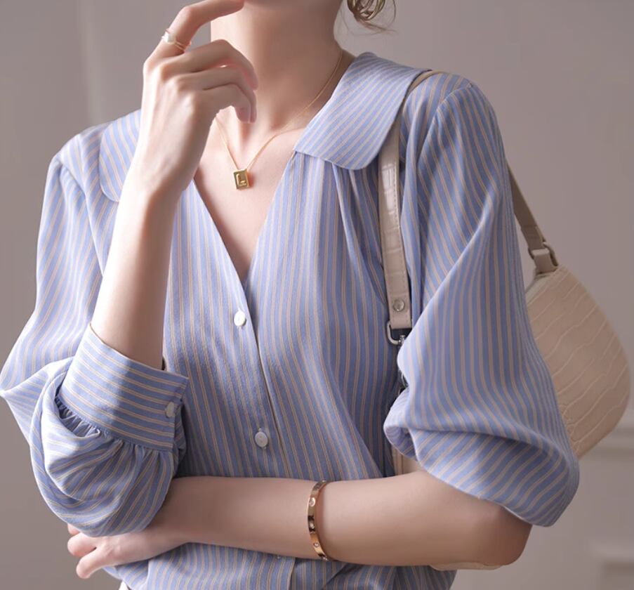 トップス シャツ ブラウス 袖あり 長袖 Vネック 襟付き シフォン きれいめ カジュアル 大人 上品 おしゃれ お洒落 大人女子 こなれ感 とろみ感 ストライプ 春 夏 秋 20代 30代 40代 レディース 女性用 ママ お出かけ 旅行 着回し 普段使い S M L XL 青 ブルー