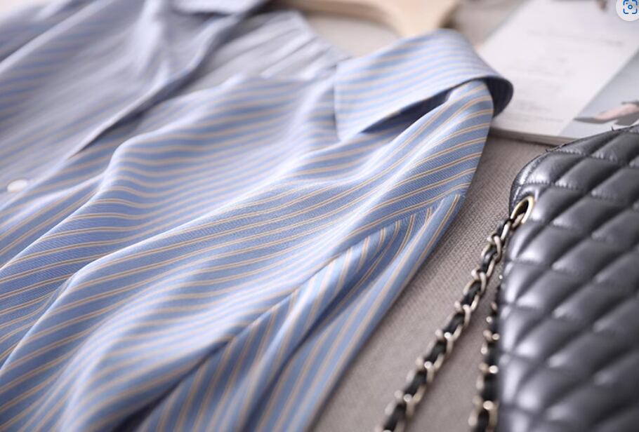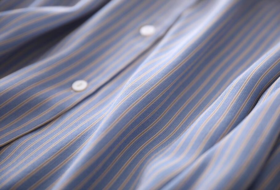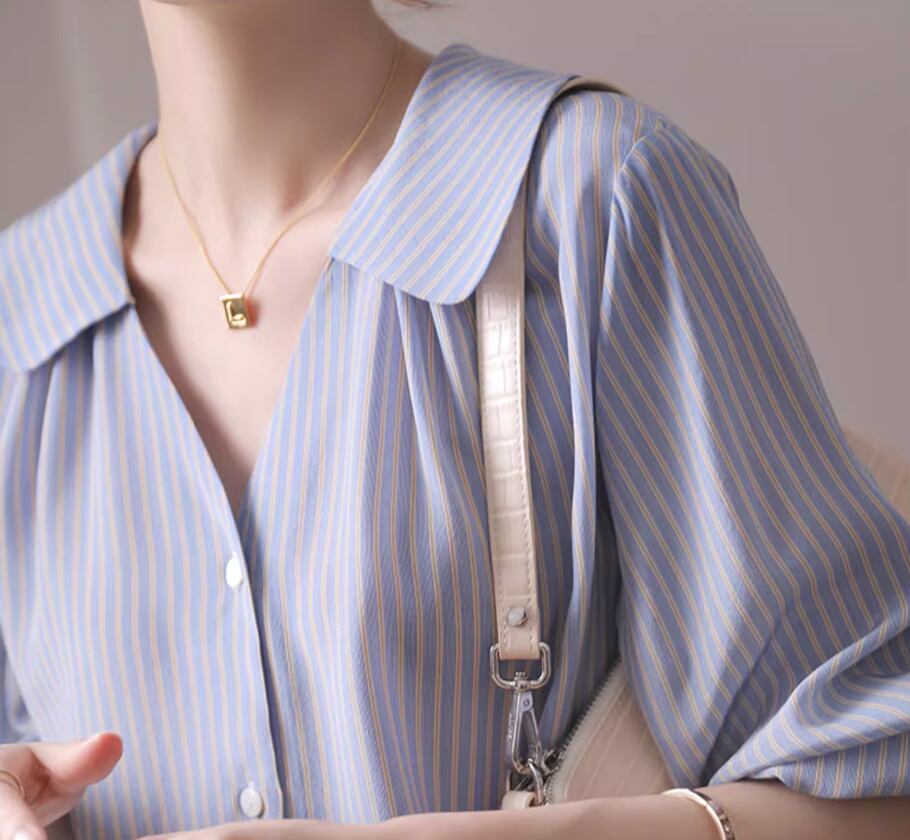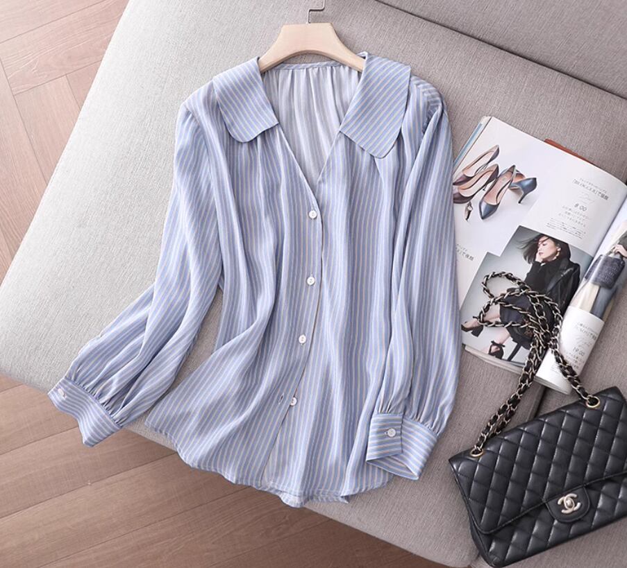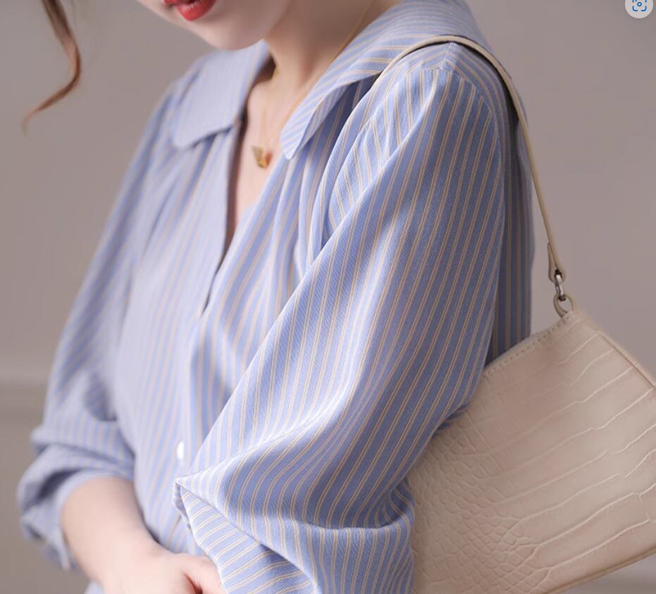 トップス シャツ ブラウス 袖あり 長袖 Vネック 襟付き シフォン きれいめ カジュアル 大人 上品 おしゃれ お洒落 大人女子 こなれ感 とろみ感 ストライプ 春 夏 秋 20代 30代 40代 レディース 女性用 ママ お出かけ 旅行 着回し 普段使い S M L XL 青 ブルー