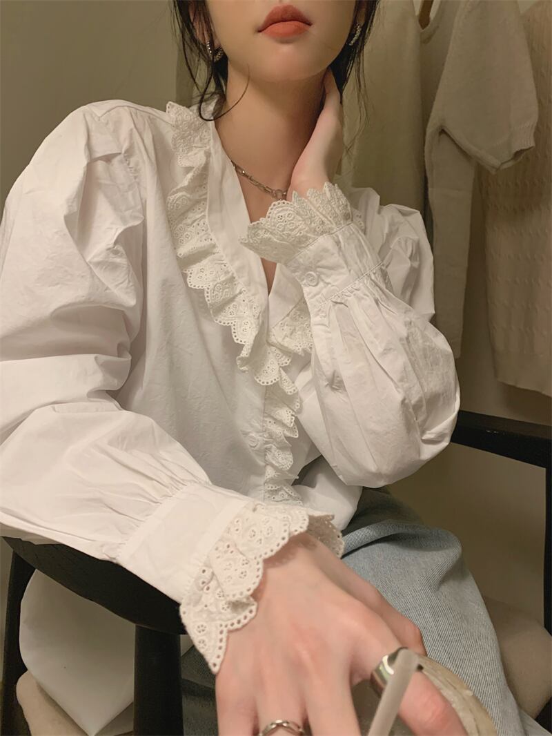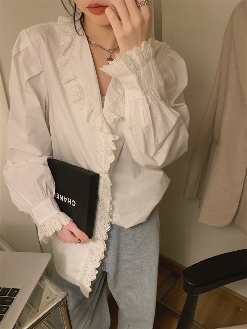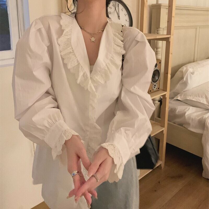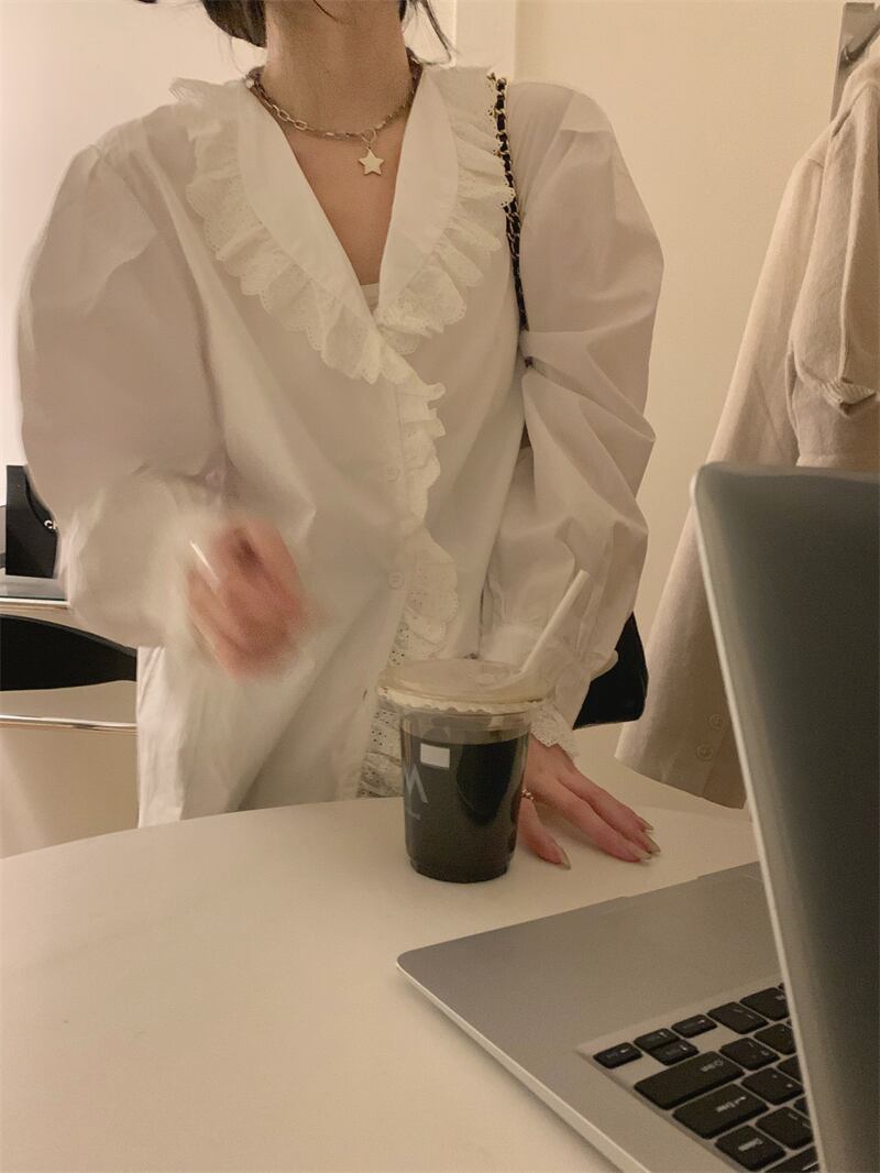 レディース トップス シャツ ブラウス パフスリーブ フリル袖 Vネック ストレート レース フリル ボタン 薄手 かわいい 大人可愛い きれいめ シンプル カジュアル おしゃれ レトロ こなれ感 ガーリー ルーズ エレガント とろみ感 抜け感 ラブリー キュート 無地 春 秋 通勤 学生 学校 通学 デート お出かけ 女子会 ショッピング カフェ 韓国 コーデ 楽ちん 体型カバー 普段使い 着回し モテ トレンド 流行 インスタ映え S M L ゆったり ゆる ホワイト
