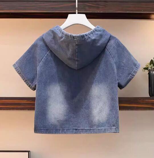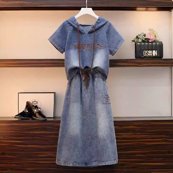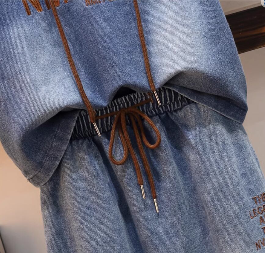 デニムセットアップ ツーピースセット 袖あり 半袖 Aライン 刺繍 サイドスリット フード付き ハイウエスト ウエストゴム デニム ブルーデニム 上下セット 2点セット お得 かわいい カジュアル ガーリー 無地 春 夏 10代 20代 レディース 女性用 学生 デート お出かけ 休日 着回し 普段使い 楽ちん S M L XL 2XL 青 ブルー