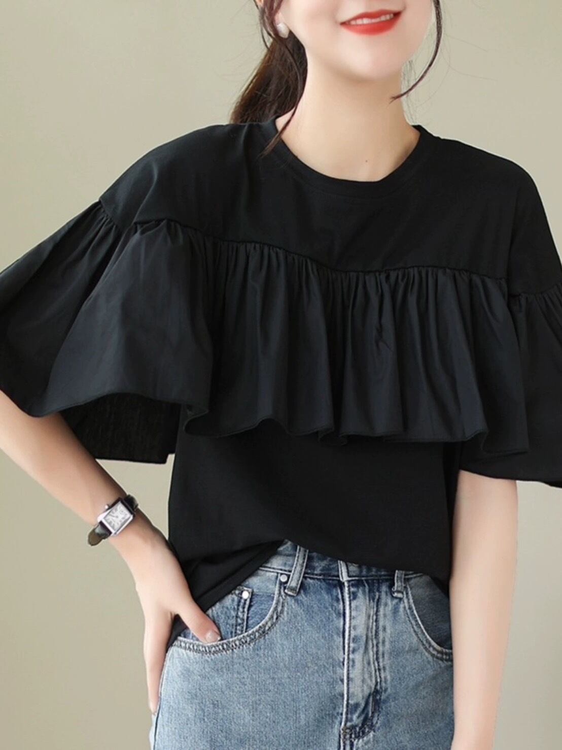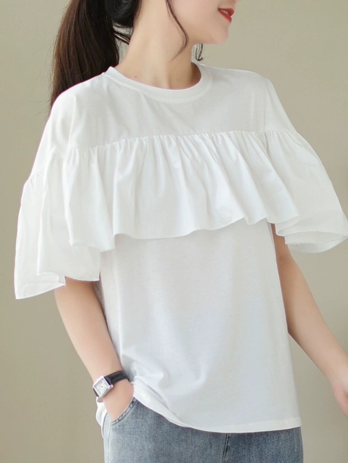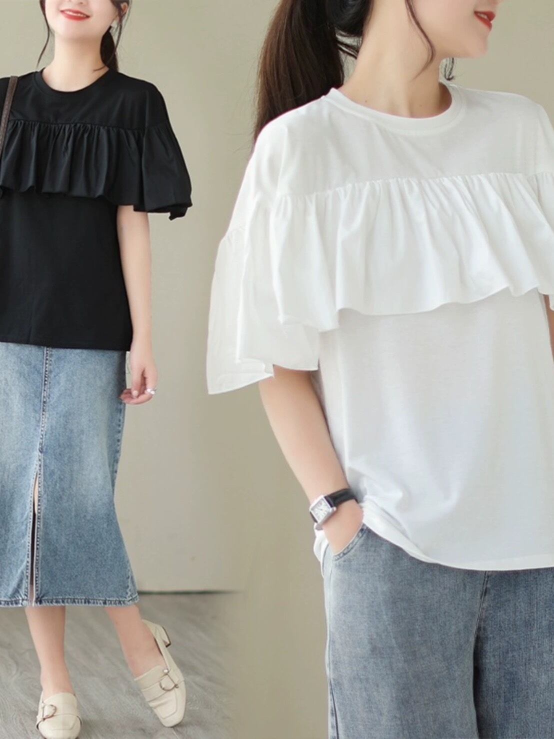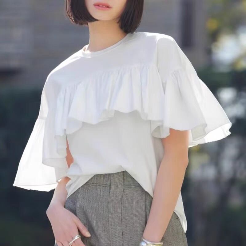 レディース トップス カットソー Tシャツ 半袖 ラウンドネック フェミニン フリル かわいい 大人可愛い シンプル カジュアル 上品 おしゃれ こなれ感 ラフ ガーリー 個性的 エレガント ラブリー キュート ベーシック 大人女子 清潔感 お洒落 華やか 爽やか 無地 春 夏 女性用 10代 20代 30代 40代 学生 デート お出かけ 公園 休日 ショッピング ライブ 普段使い 着回し 清楚 定番 デイリー 動きやすい フリーサイズ 白 ホワイト 黒 ブラック 2色展開