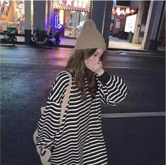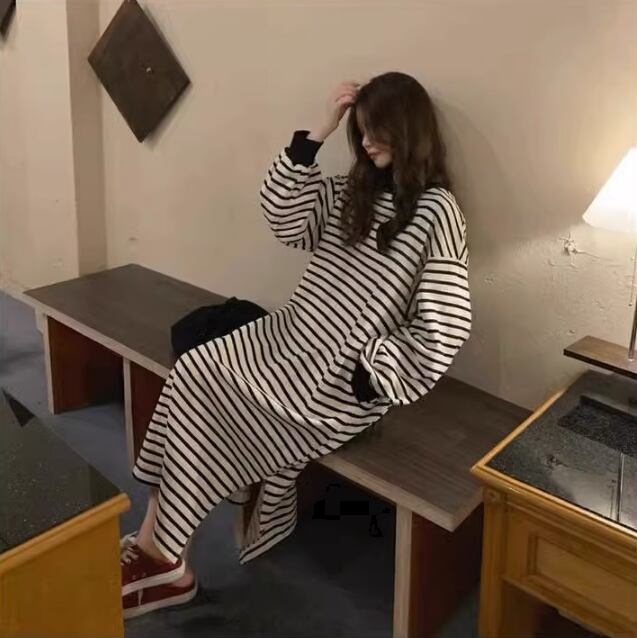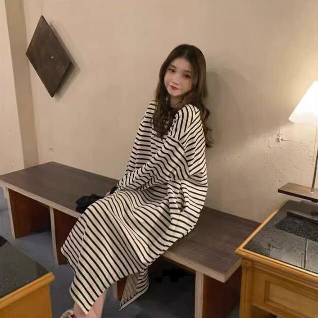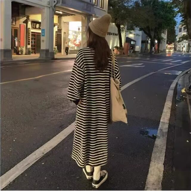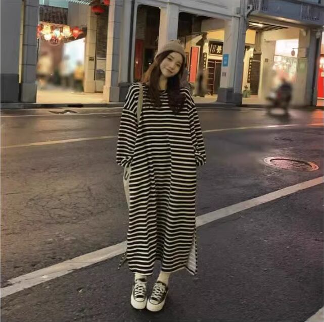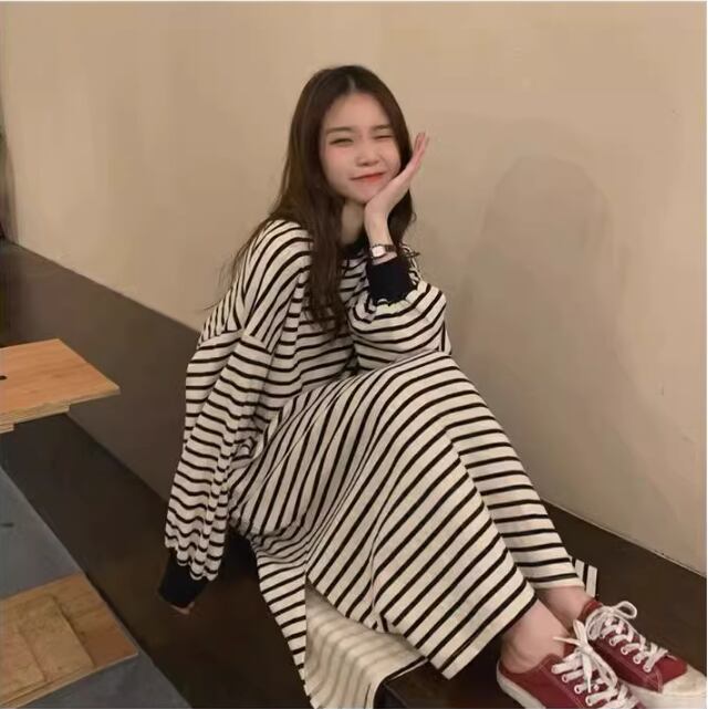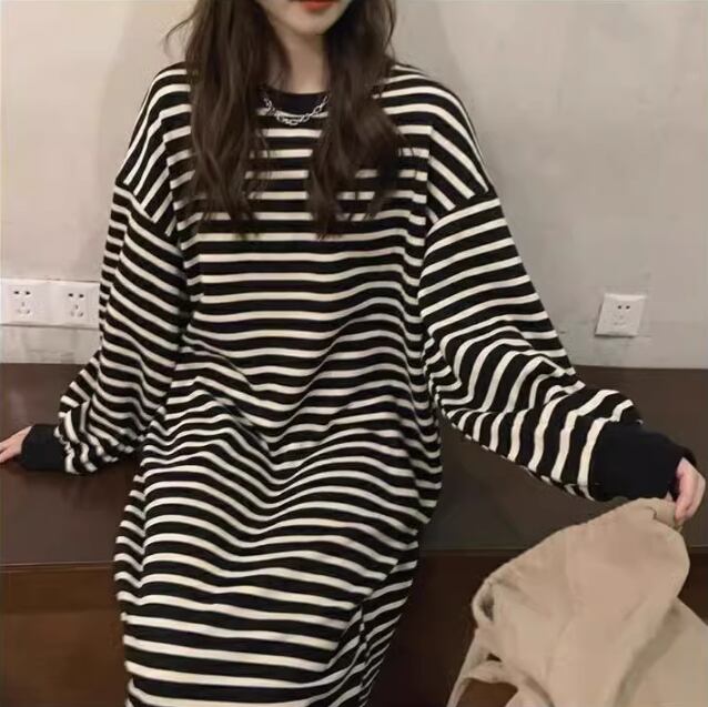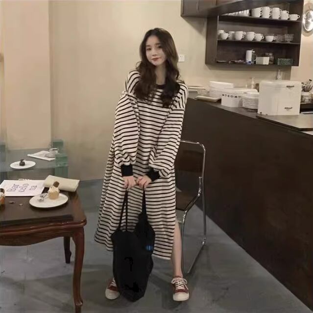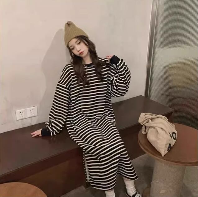 ワンピース レディース ロング 長袖 ボリューム袖 ドロップショルダー 萌袖 ラウンドネック ワイド ストレート オーバーサイズ サイドスリット かわいい シンプル カジュアル おしゃれ こなれ感 ラフ ガーリー ルーズ 個性的 クール 存在感 抜け感 キュート ボーダー 秋 冬 学生 学校 通学 デート お出かけ アウトドア キャンプ 旅行 休日 モノトーン 双子 コーデ 楽ちん 体型カバー 普段使い インスタ映え 定番 M L XL 2XL 大きいサイズ ビッグ ゆったり ゆる ホワイト ブラック