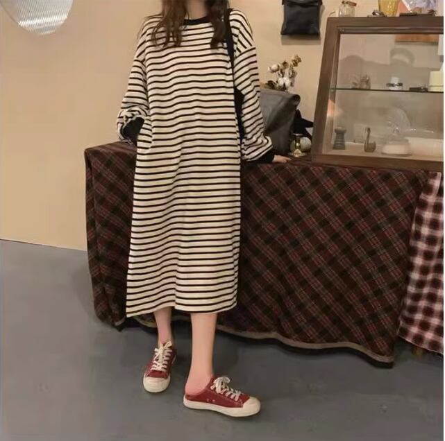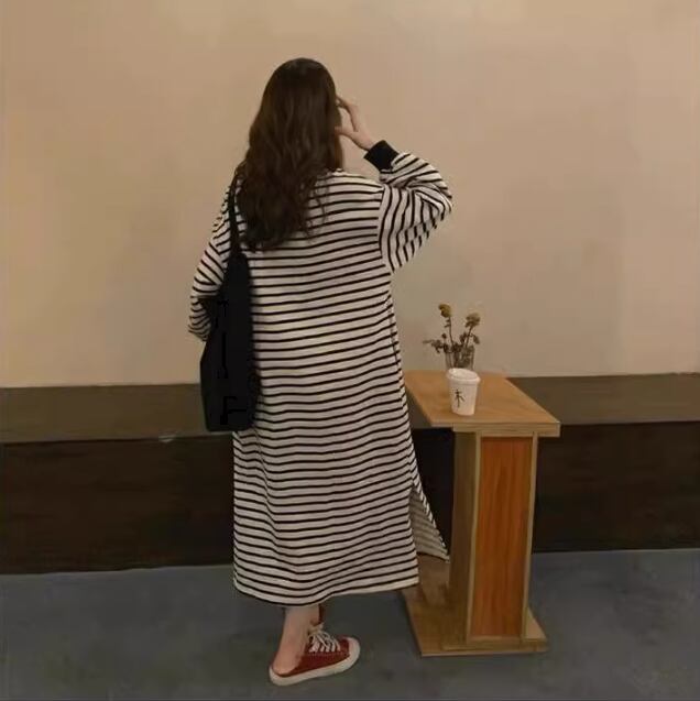 リラックスしたい日にぴったりな、ゆるっとしたシルエットが魅力のボーダーロングワンピース。