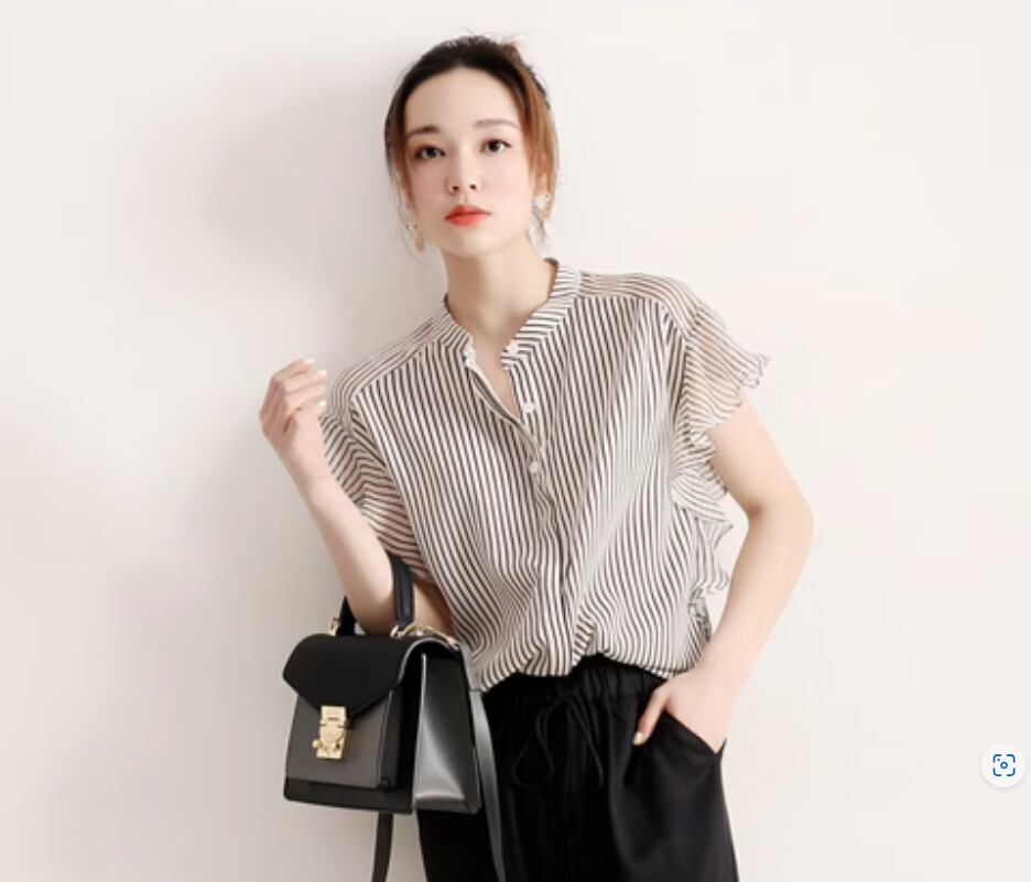 トップス シャツ ブラウス 袖あり フレアスリーブ スタンドカラー シフォン 透け感 ポリエステル 薄手 かわいい 大人可愛い シンプル カジュアル おしゃれ お洒落 ストライプ 春 夏 20代 30代 40代 レディース 女性用 ママ お出かけ 休日 着回し 普段使い 楽ちん M L XL 2XL 黒 ブラック