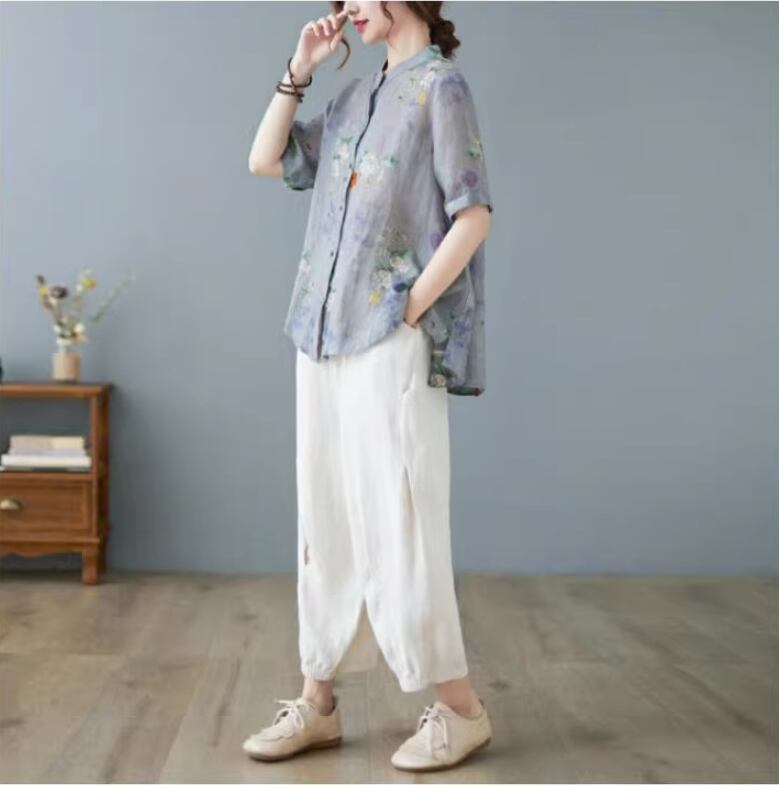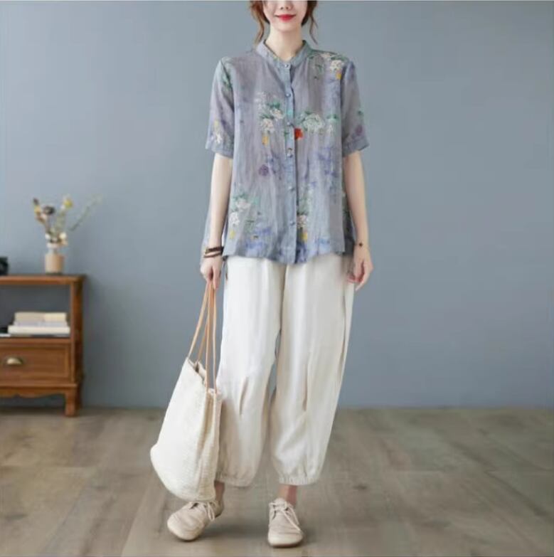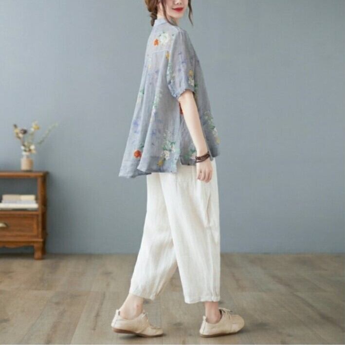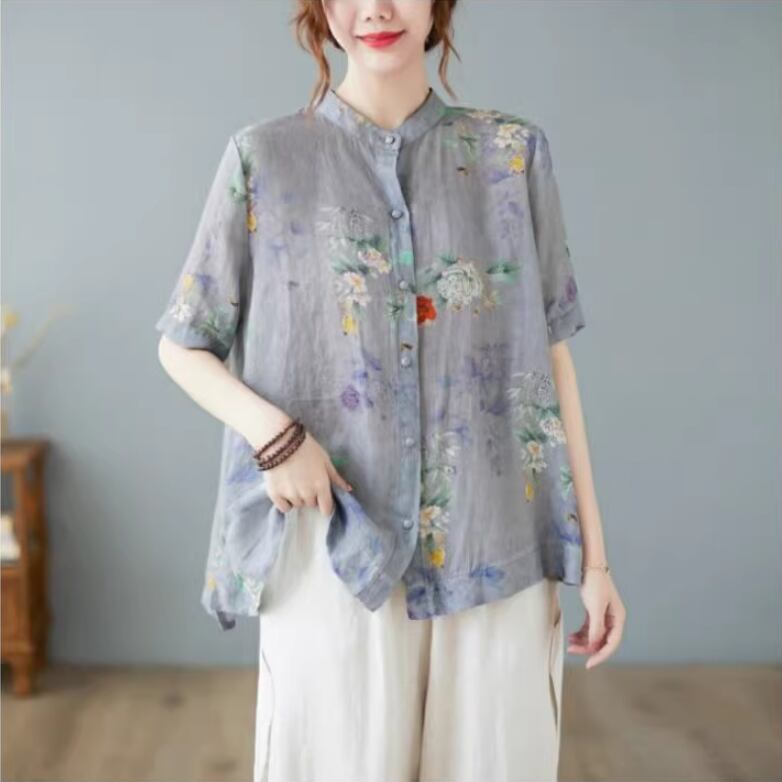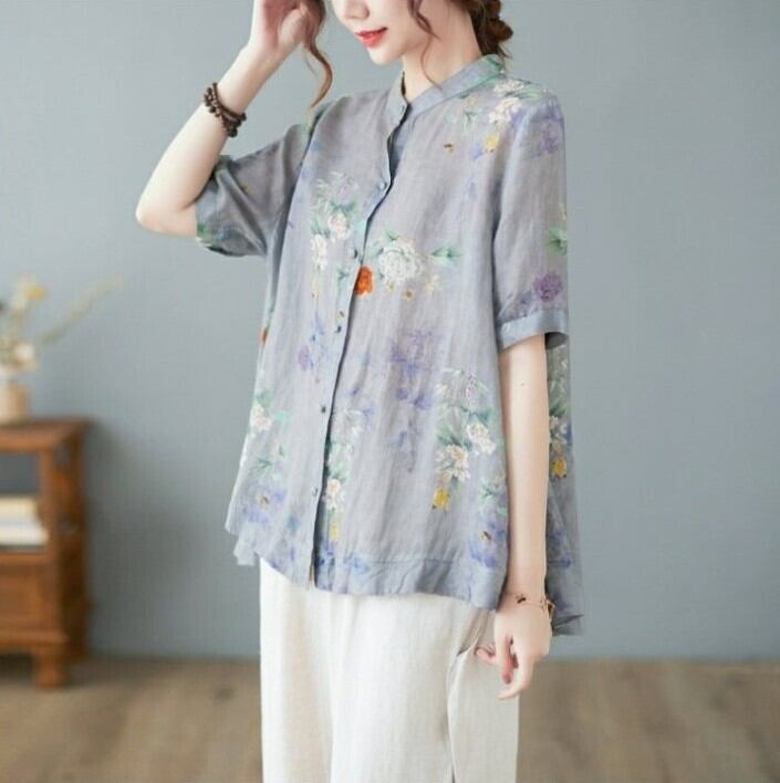 トップス シャツ レディース 半袖 モックネック スタンドカラー ワイド ストレート 前開き 透け感 ボタン 薄手 大人可愛い カジュアル 上品 おしゃれ レトロ アジアン こなれ感 ラフ ルーズ エレガント 存在感 とろみ感 抜け感 キュート クラシカル 花柄 夏 ママ オフィス OL 通勤 お出かけ お泊まり リゾート 旅行 海 女子会 休日 バカンス ショッピング 楽ちん 体型カバー 普段使い 着回し L XL 2XL 大きいサイズ ビッグ ゆったり ゆる グレー くすみ 大人カラー パープル