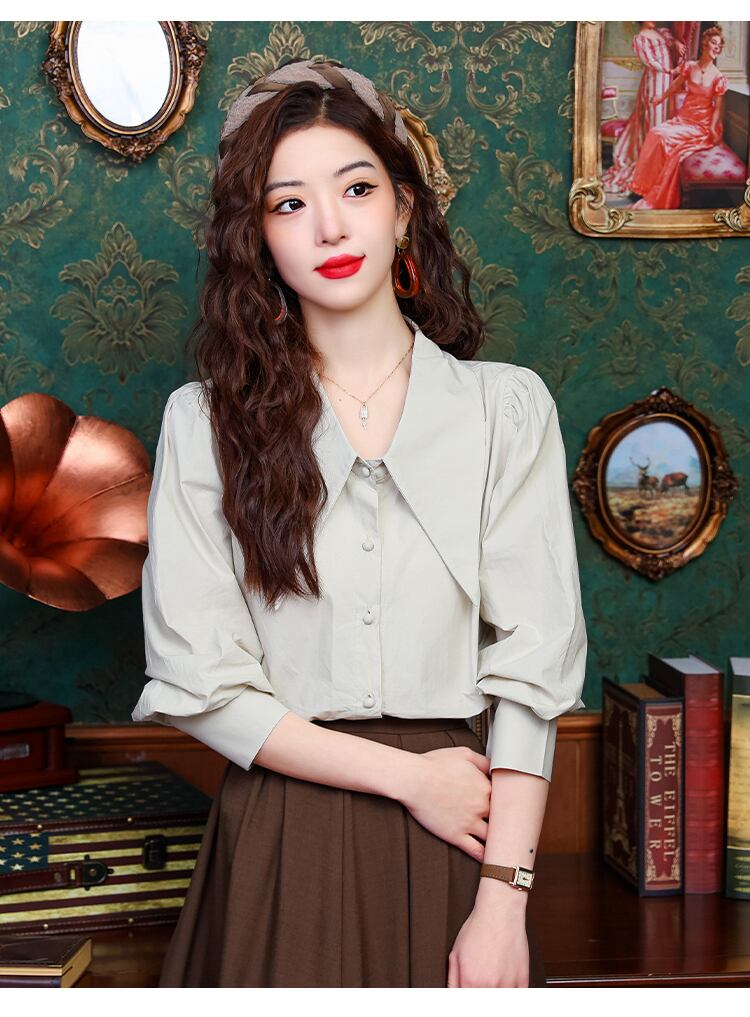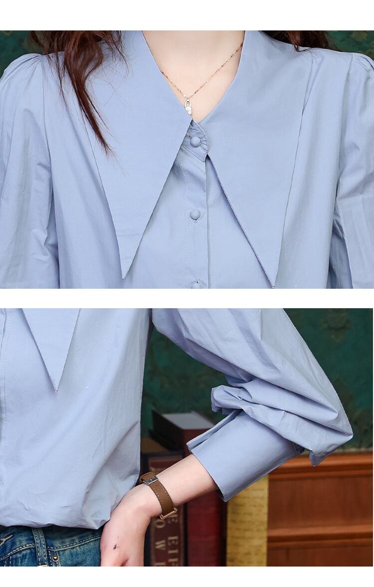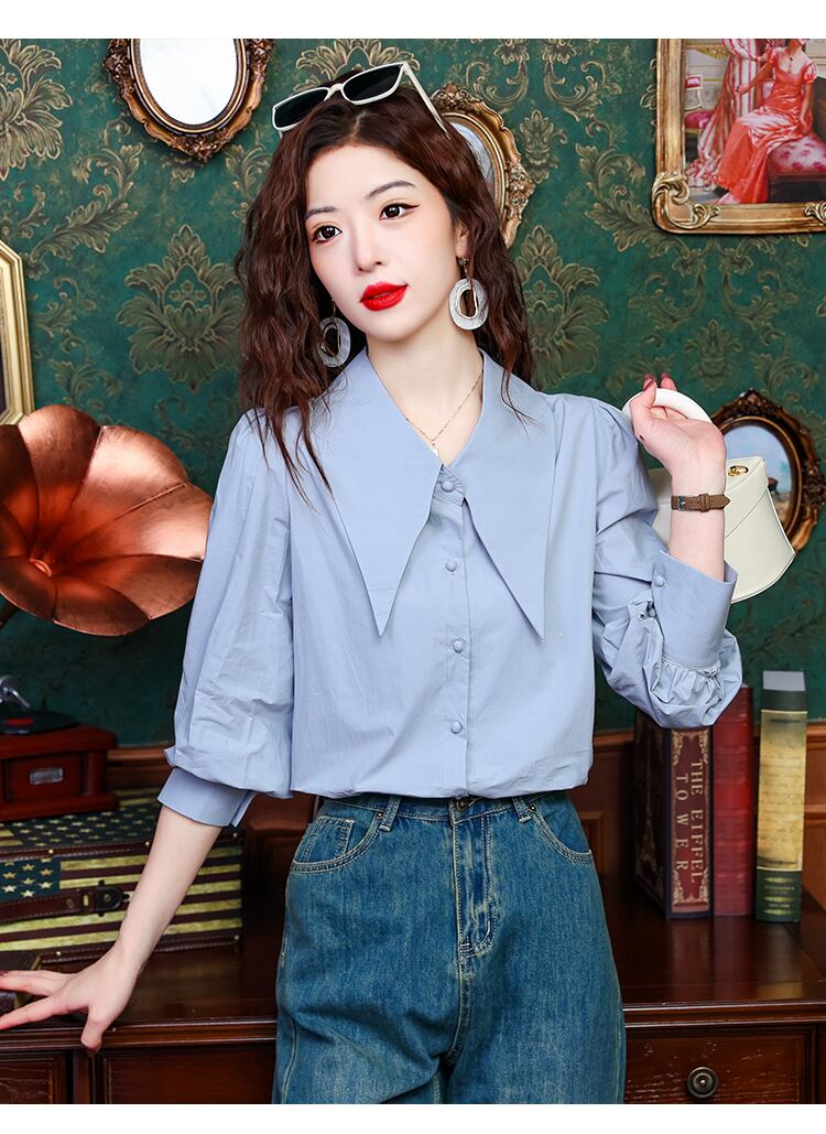大人可愛いシャツブラウスをお探しの方にオススメ!大きめの襟とかわいいショート丈が特徴のこちらのトップスは、デートや女子会、お出かけにぴったりのアイテムです。フレアスリーブが女性らしい印象を与え、上品な雰囲気を演出します。シンプルでありながらも個性的なデザインは主役級の存在感を放ち、他と差をつけたい方におすすめです。