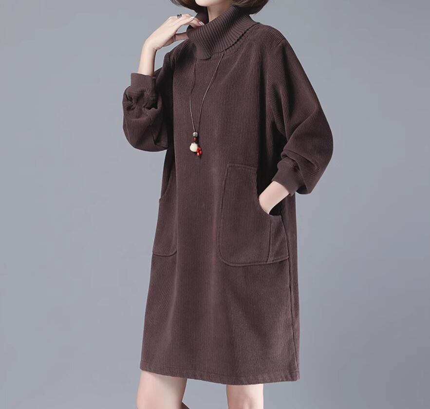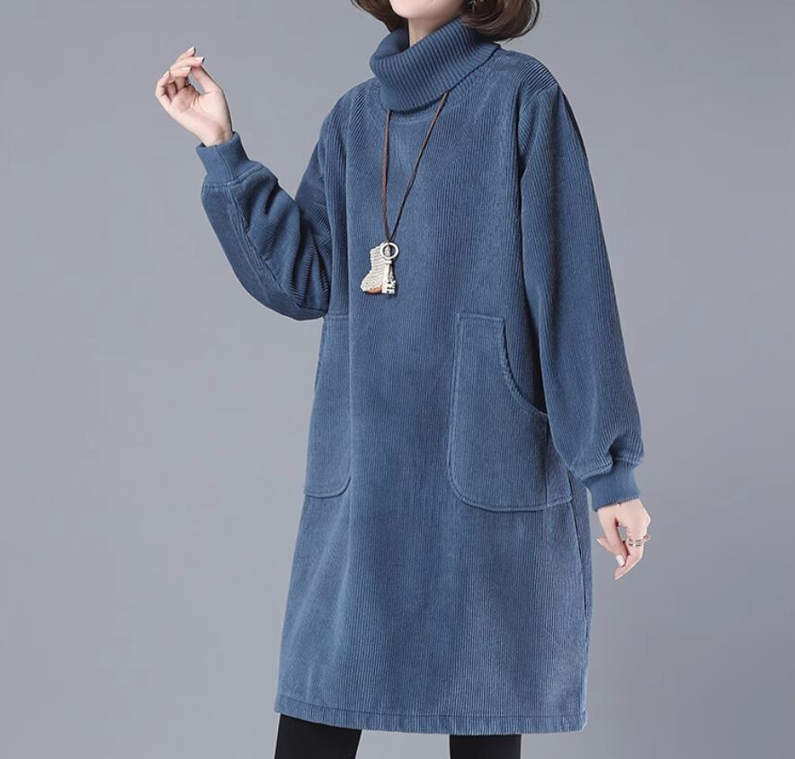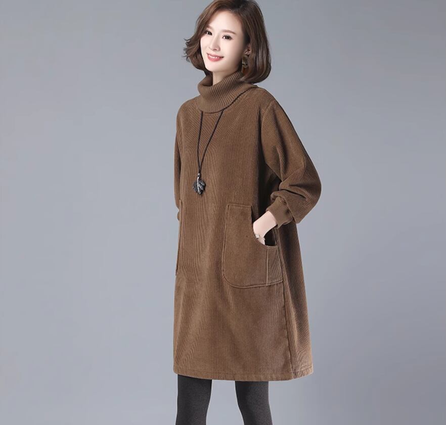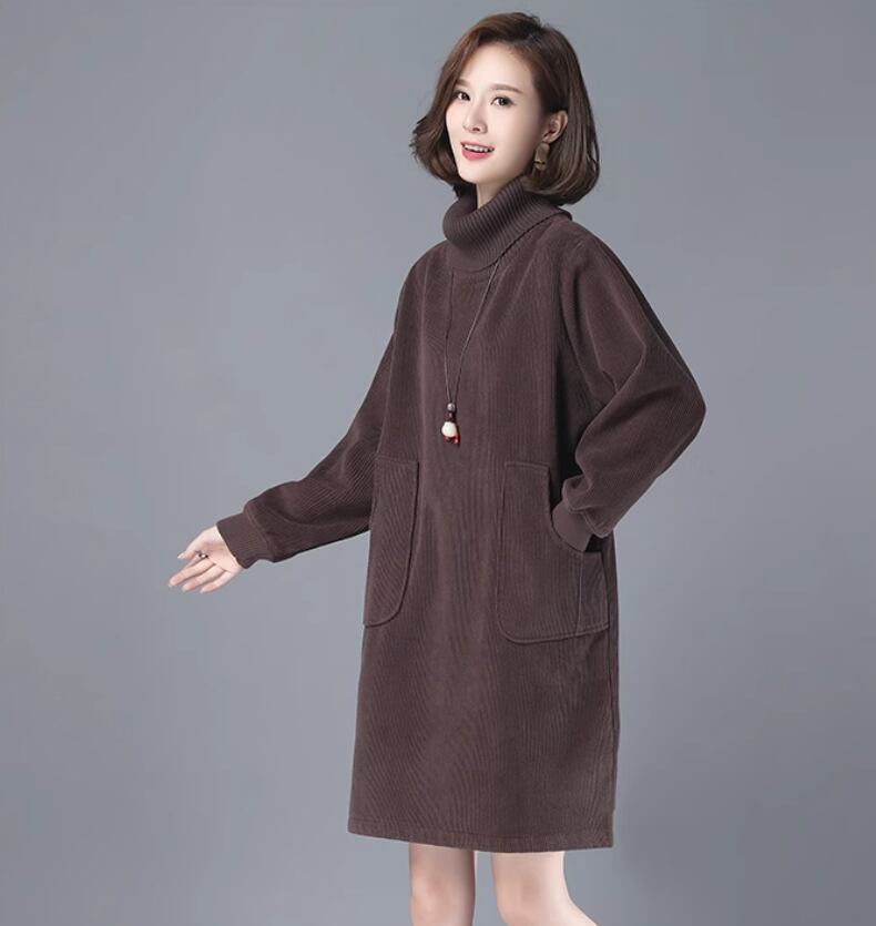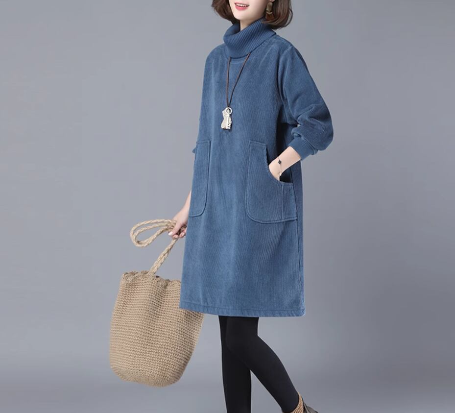 ワンピース 膝上 袖あり 長袖 タートルネック ストレート もこもこ ポケット 厚手 コーデュロイ かわいい シンプル カジュアル レトロ 秋 冬 10代 20代 30代 40代 レディース ママ お出かけ 休日 着回し 普段使い 楽ちん 暖かい 体型カバー M L XL 2XL 青 ブルー 茶色 ブラウン ダークパープル