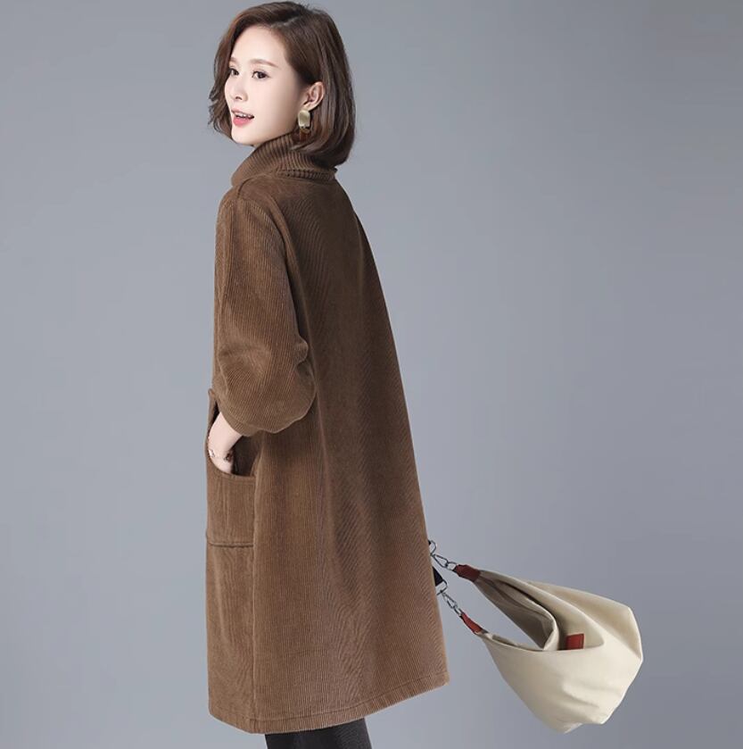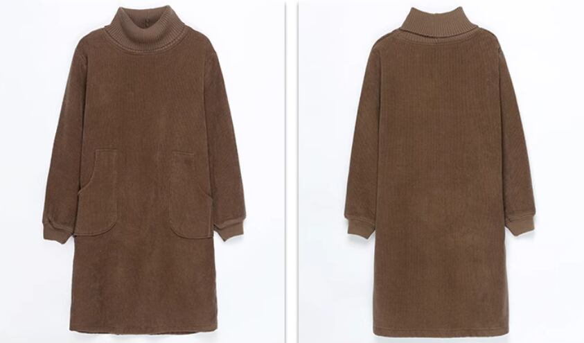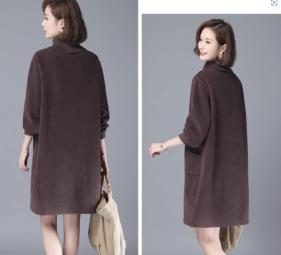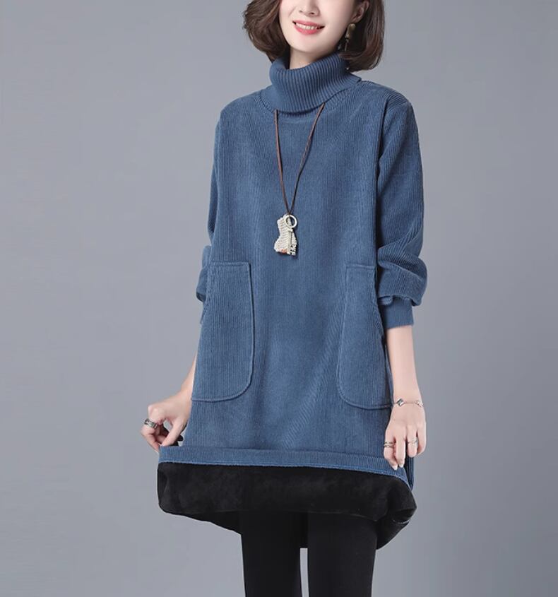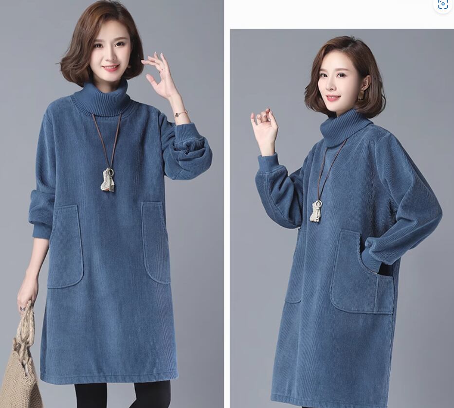 ワンピース 膝上 袖あり 長袖 タートルネック ストレート もこもこ ポケット 厚手 コーデュロイ かわいい シンプル カジュアル レトロ 秋 冬 10代 20代 30代 40代 レディース ママ お出かけ 休日 着回し 普段使い 楽ちん 暖かい 体型カバー M L XL 2XL 青 ブルー 茶色 ブラウン ダークパープル