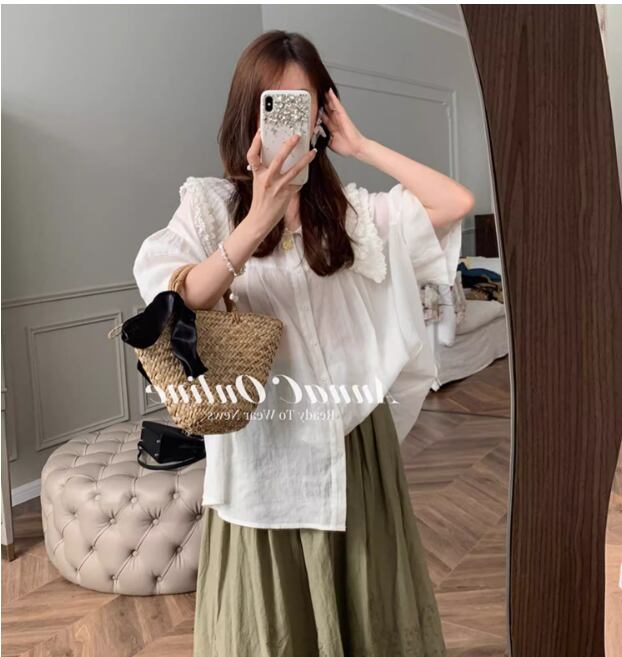 上品なセーラーカラーとビッグ襟が特徴の、かわいい5分袖ブラウスです。パフスリーブやレースの刺繍が、さりげなく個性的な印象を与え、カジュアルから上品な着こなしまで幅広く対応します。シンプルなデザインながら、エレガントさも漂わせる一着。春から秋まで活躍する、おしゃれなトップスです。